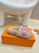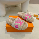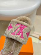 LV Fur Slippers Light Brown With Pink Text Pure Wool