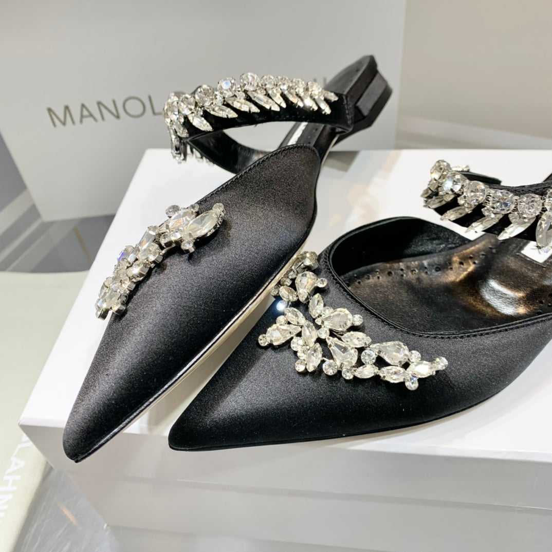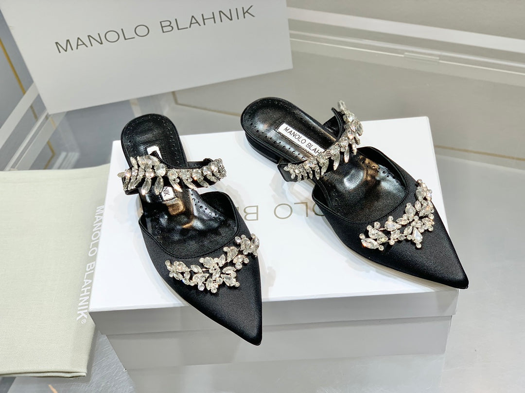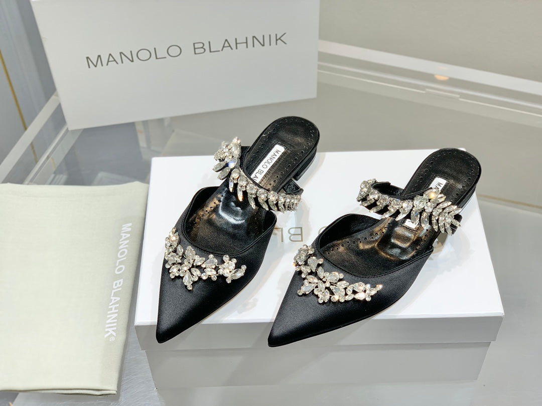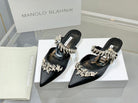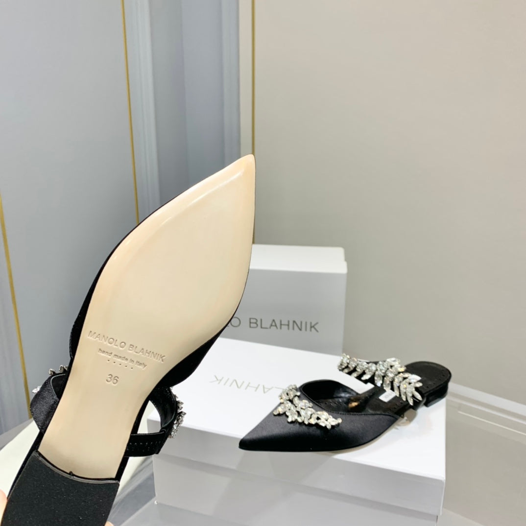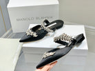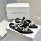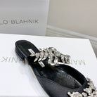 Manolo Flats Mules Crystal Black Silk Satin 327467