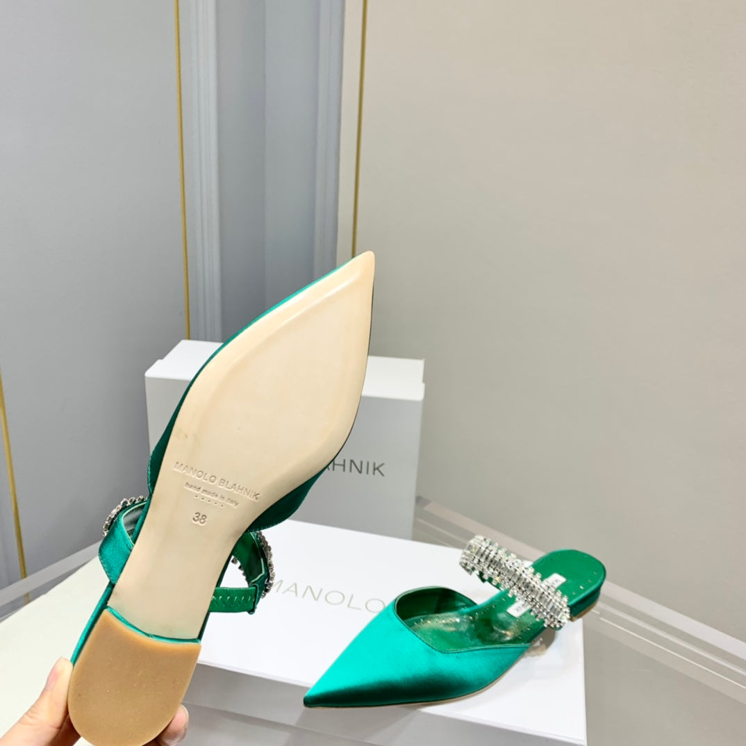 Manolo Mules Crystal Green Silk Satin 219387