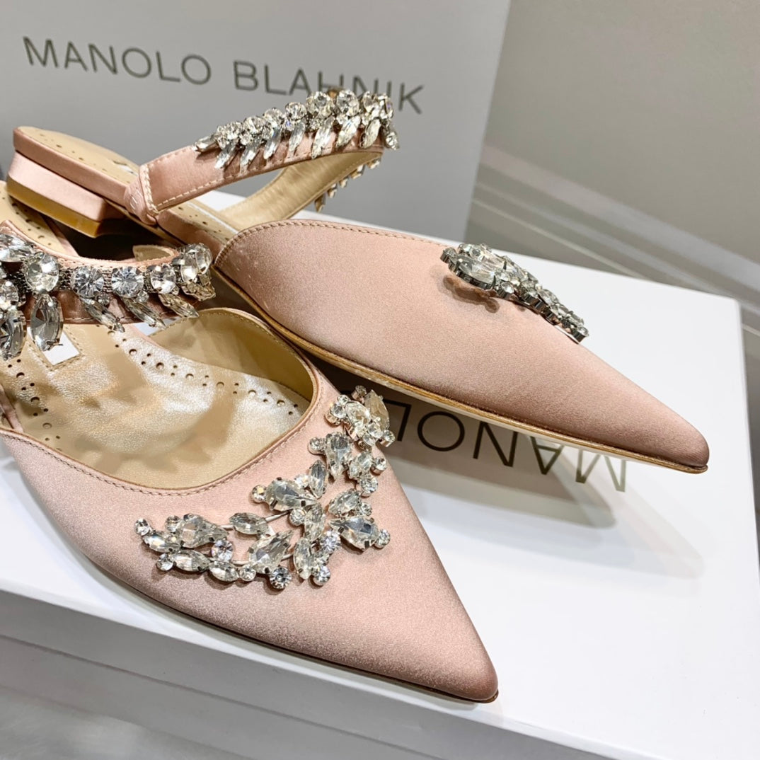 Manolo Flats Mules Crystal Pink Nude Silk Satin 327468