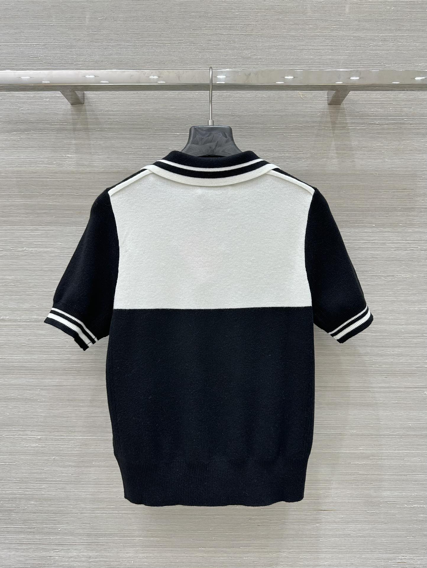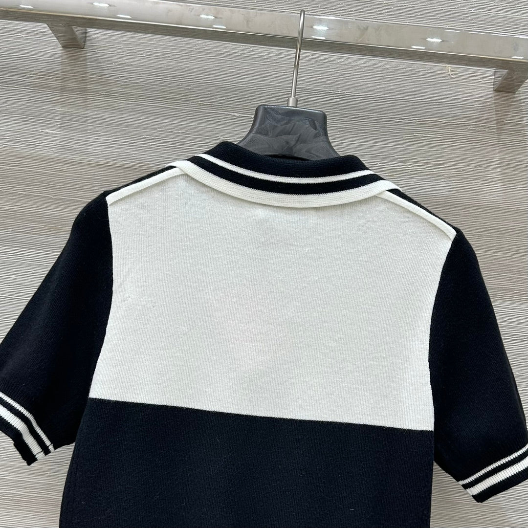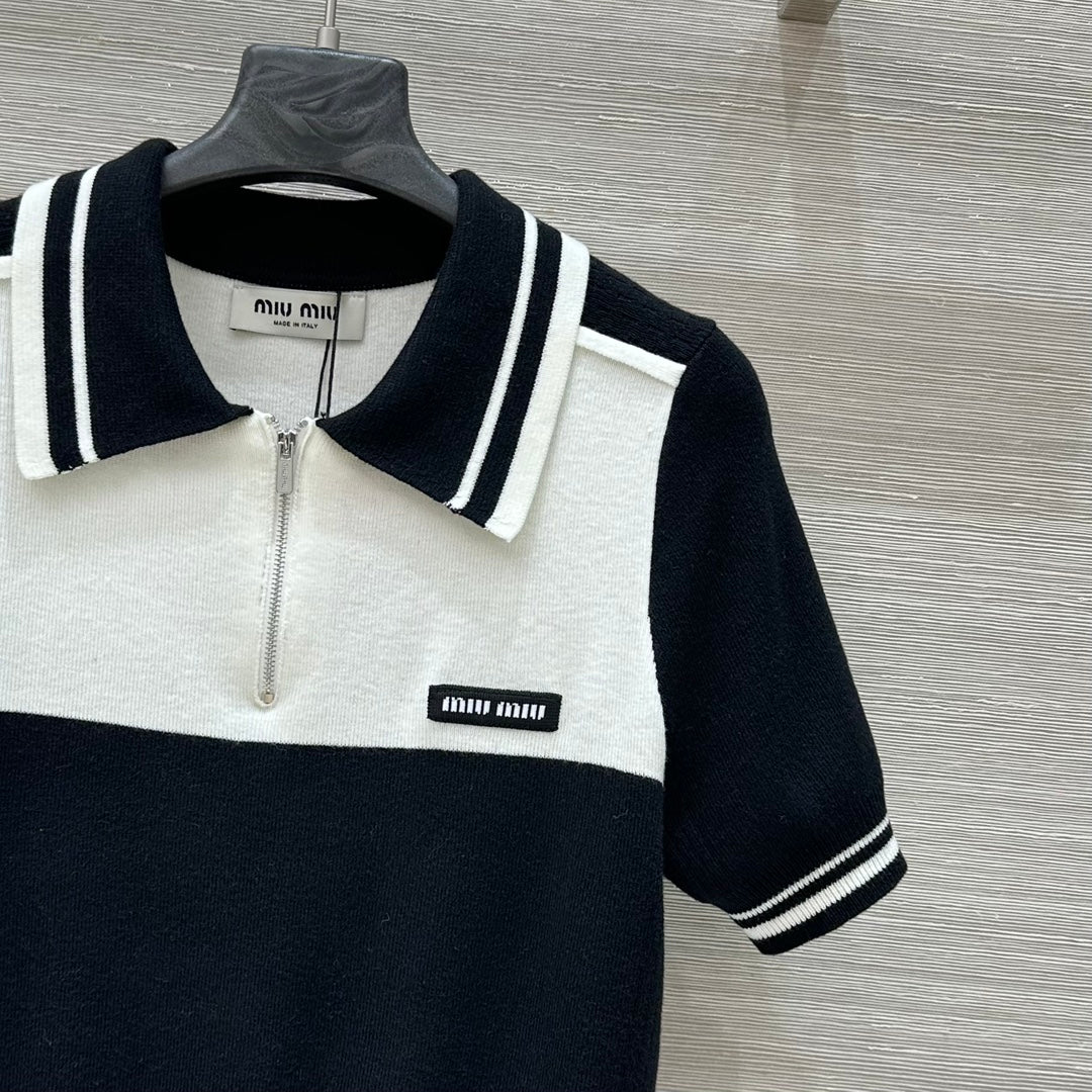 Miu Miu 25 Polo Collar Short-sleeved Top Black White Tencel