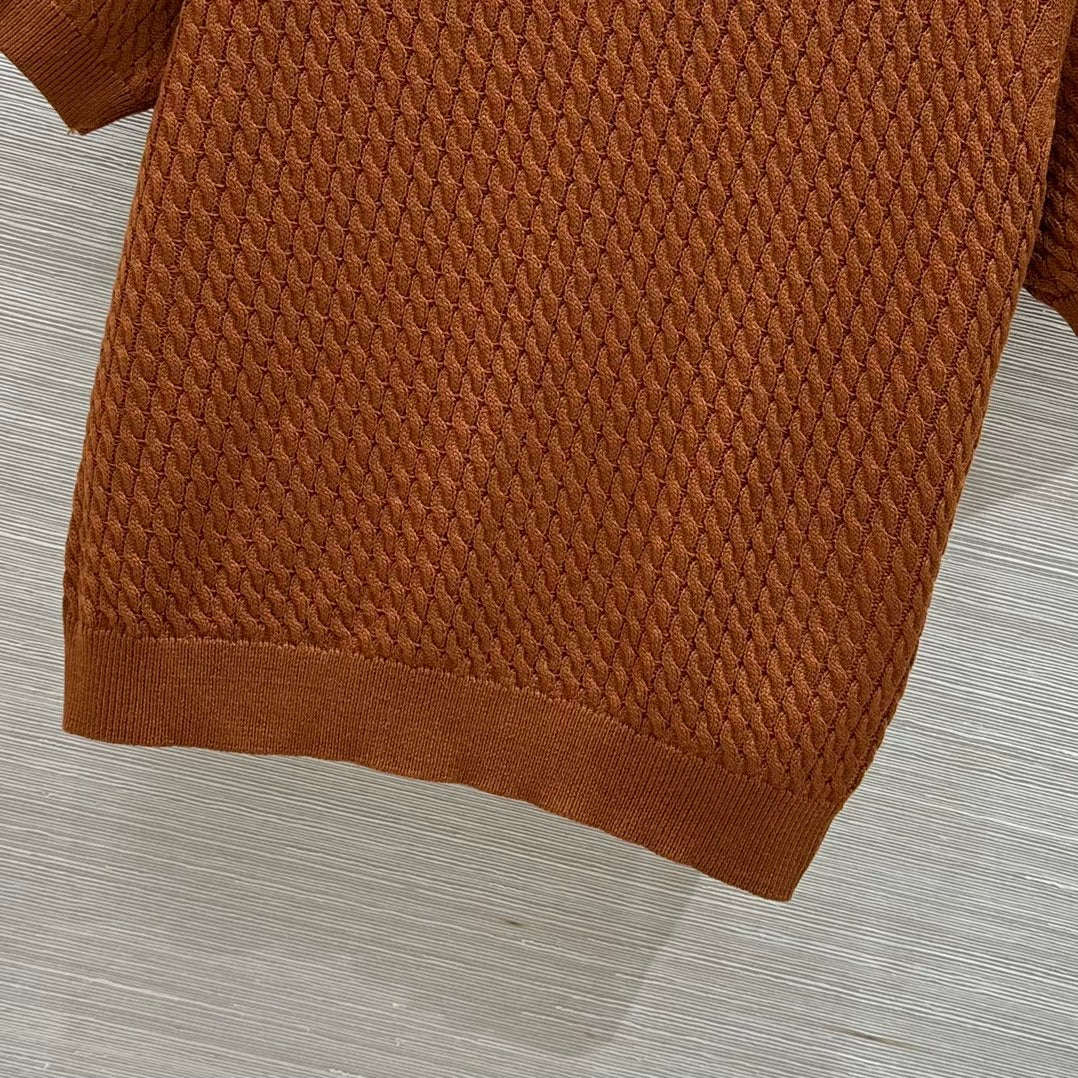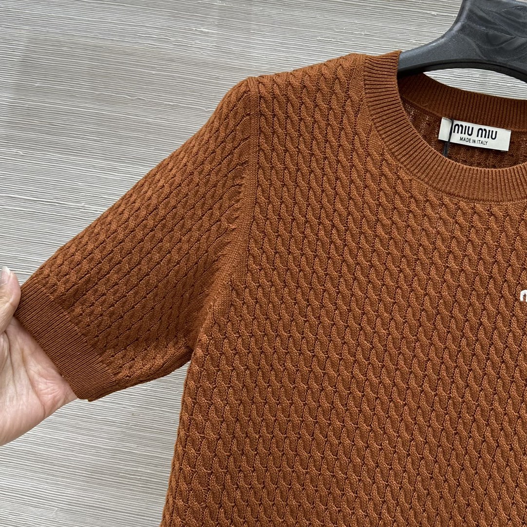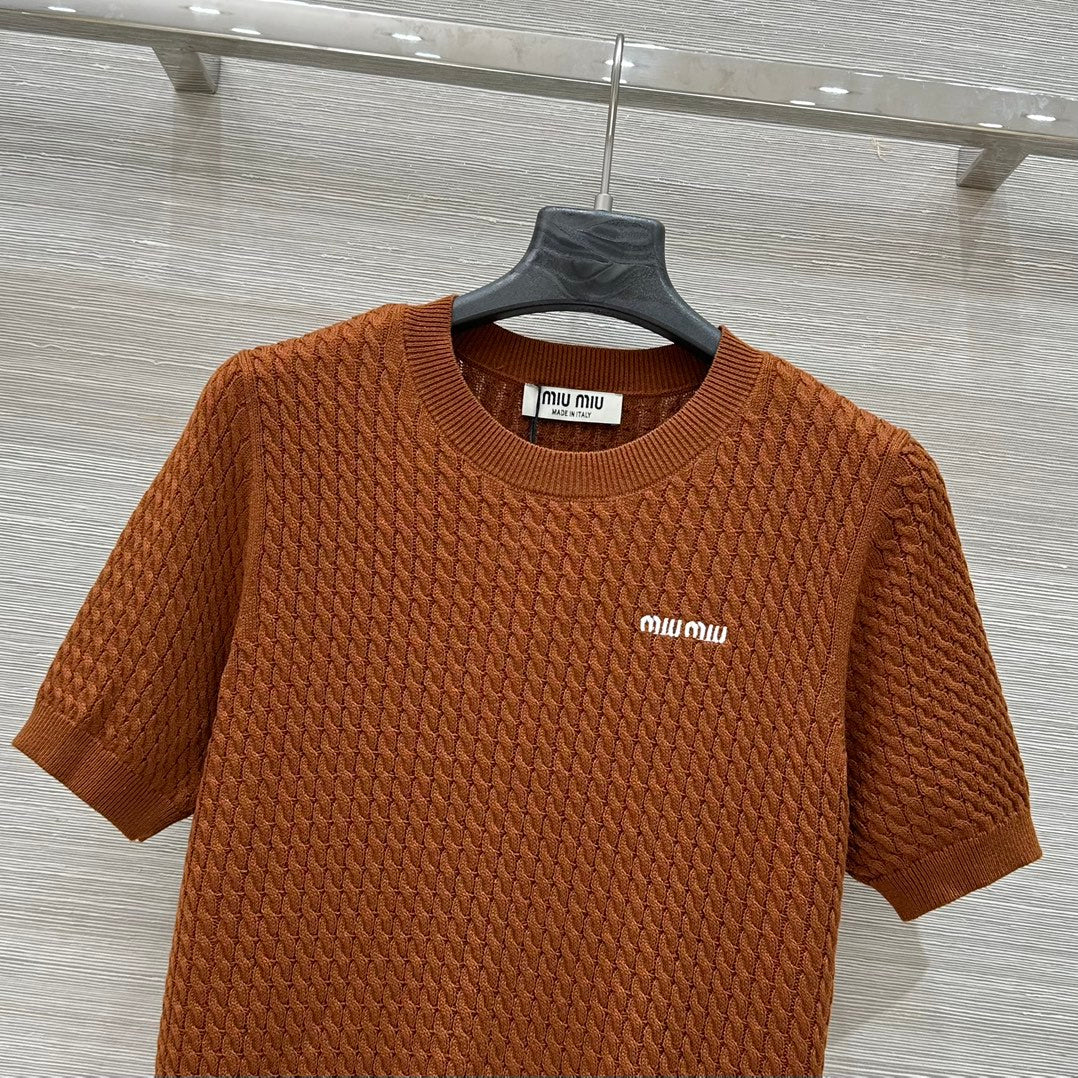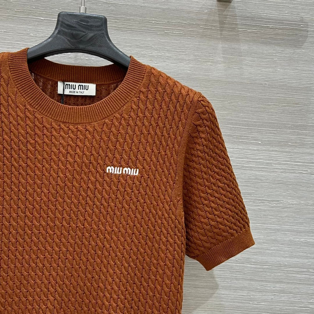 Miu Miu Short-sleeved Knitted Sweater Brown Cream Cotton