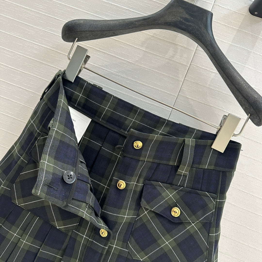 Miu Miu Plaid Pleated Skirt Green Blue Wool