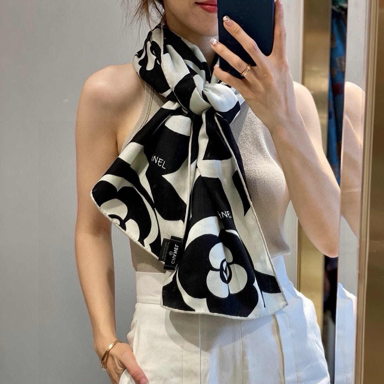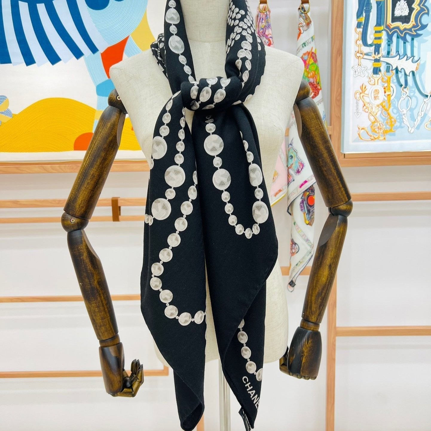 CC Scarf 185 CM In White Black Printed Pattern Cashmere Silk 371904