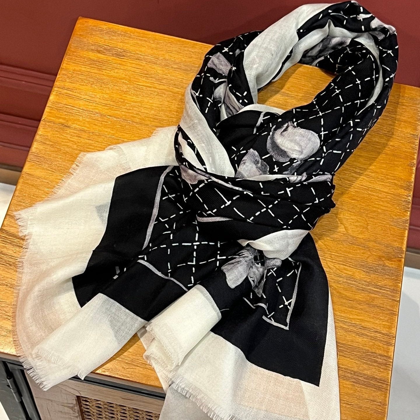 CC Scarf 190 CM In Black And White Floral Print Cashmere Silk 208542