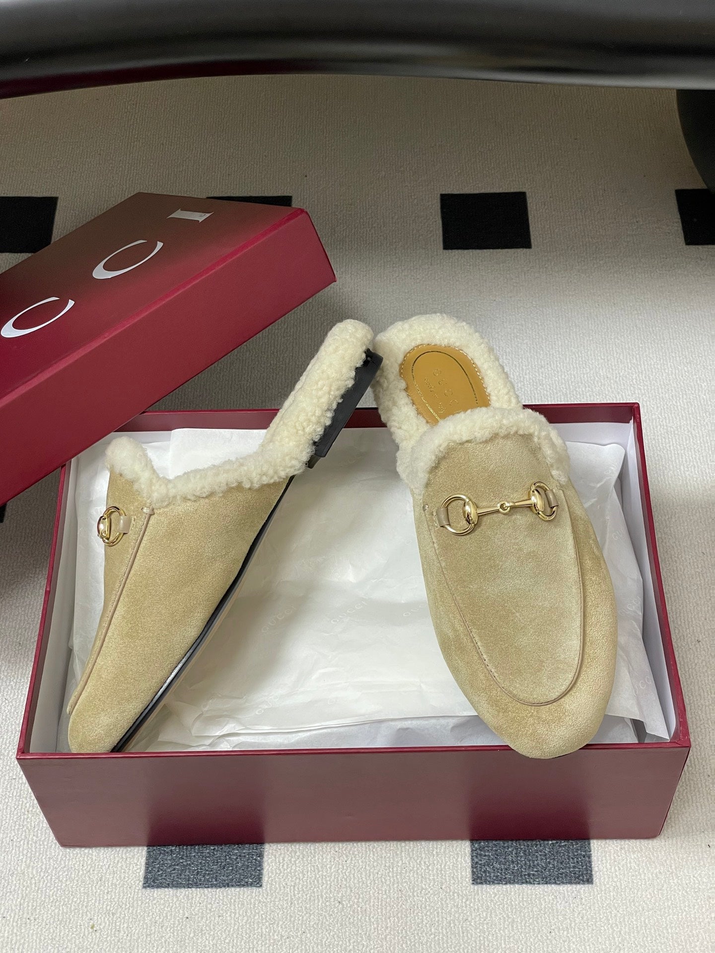 GG horsebit flat mules ivory suede and wool 534709