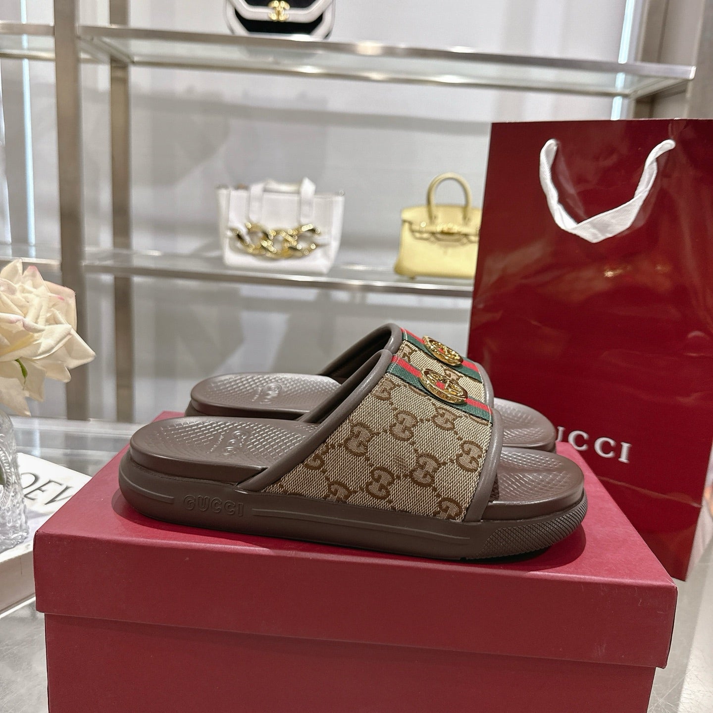 GG Men's 25 Slide Yellow Brown Calfskin 540252
