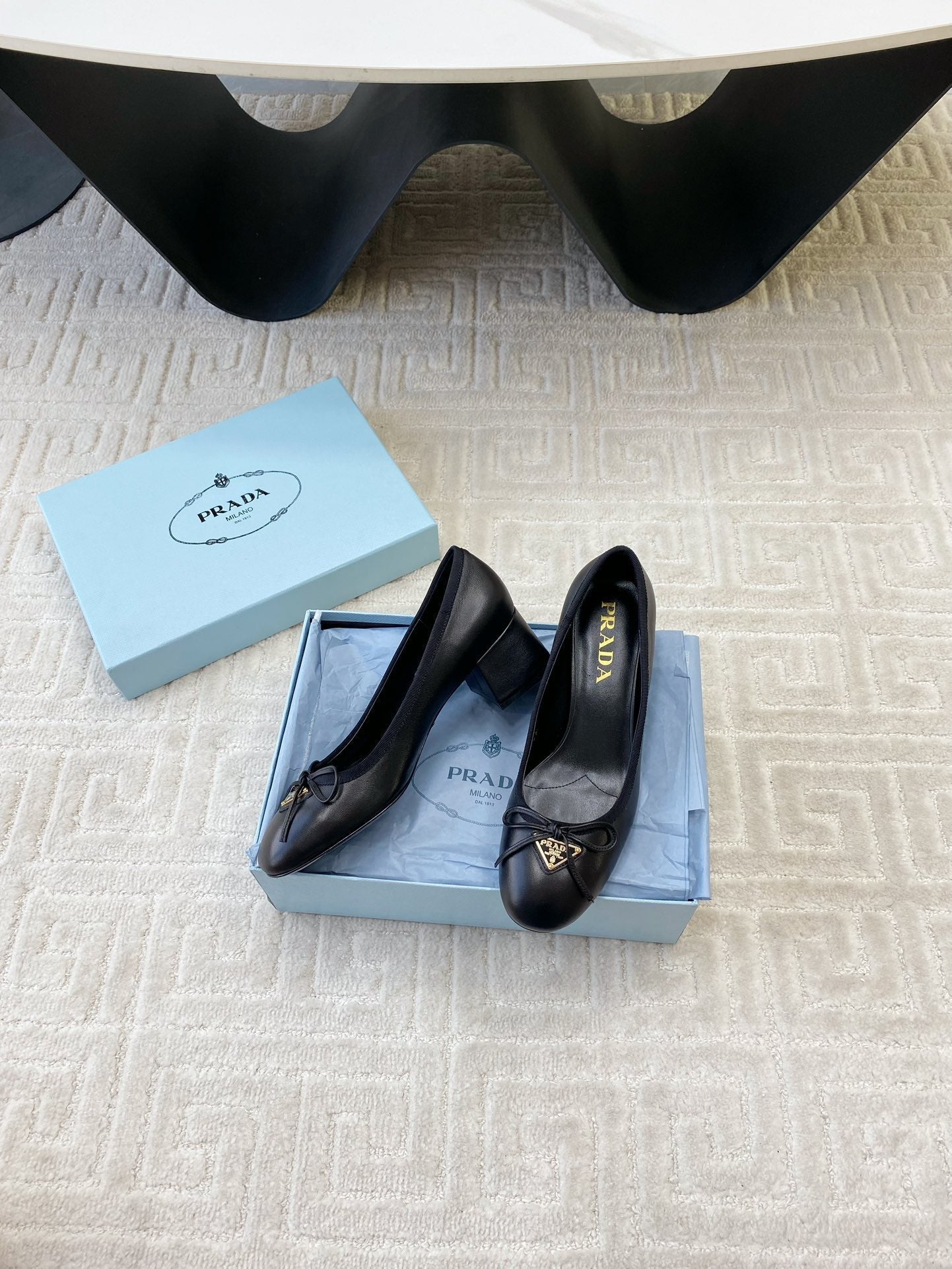 BALLERINA PUMPS WITH TRIANGLE LOGO AND BOW IN BLACK CALFSKIN