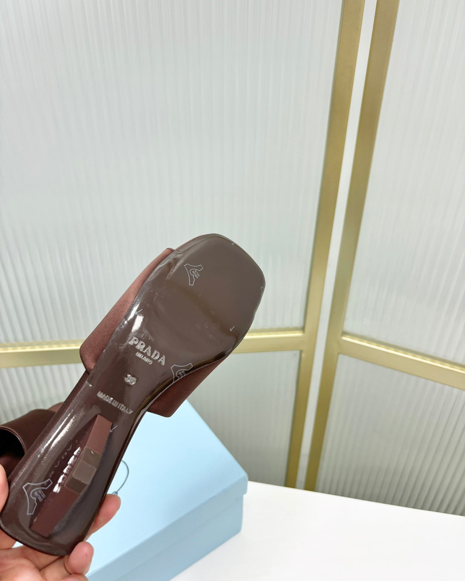 PRA TRIANGLE HEEL SATIN SLIPPERS BROWN