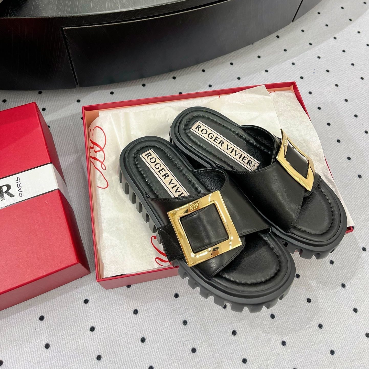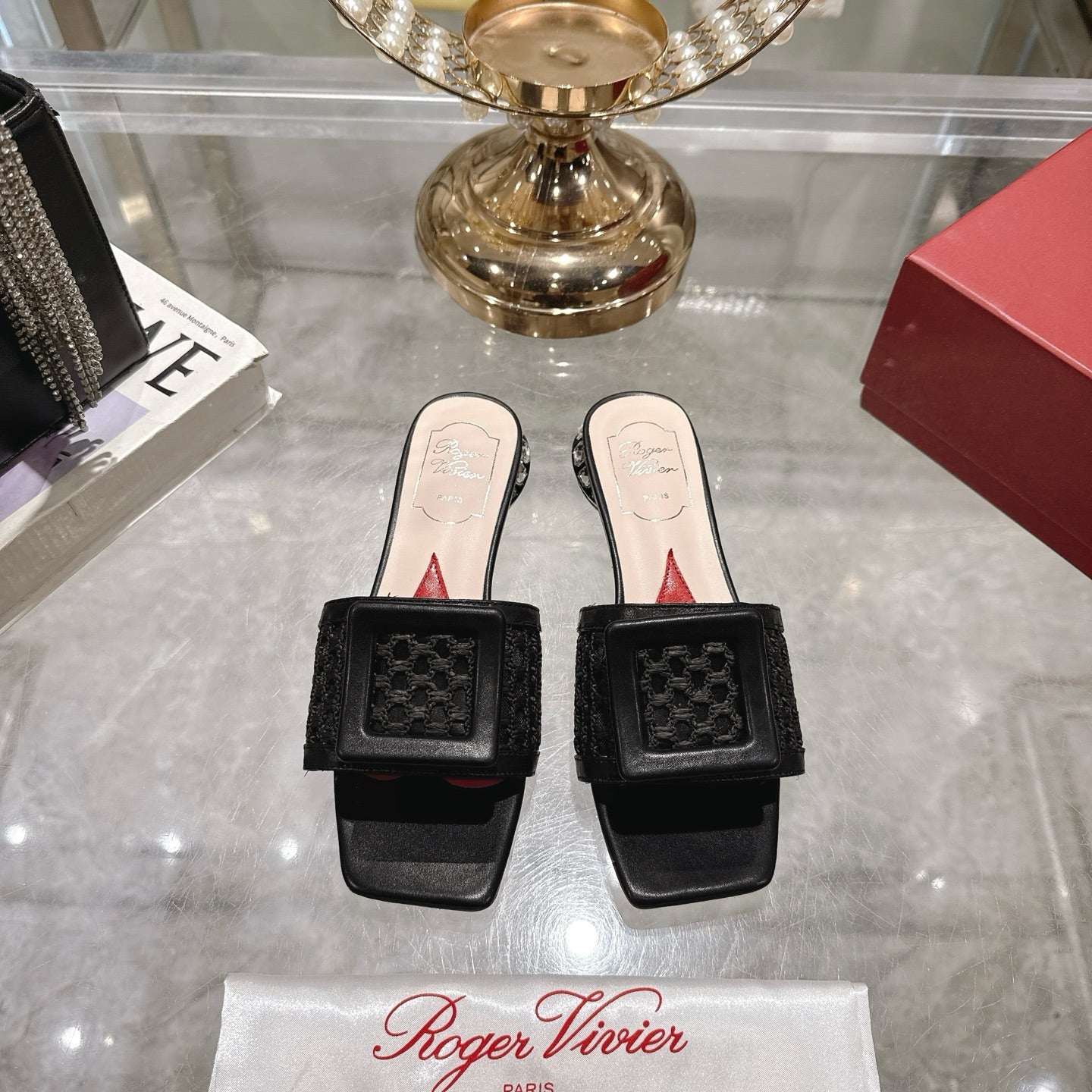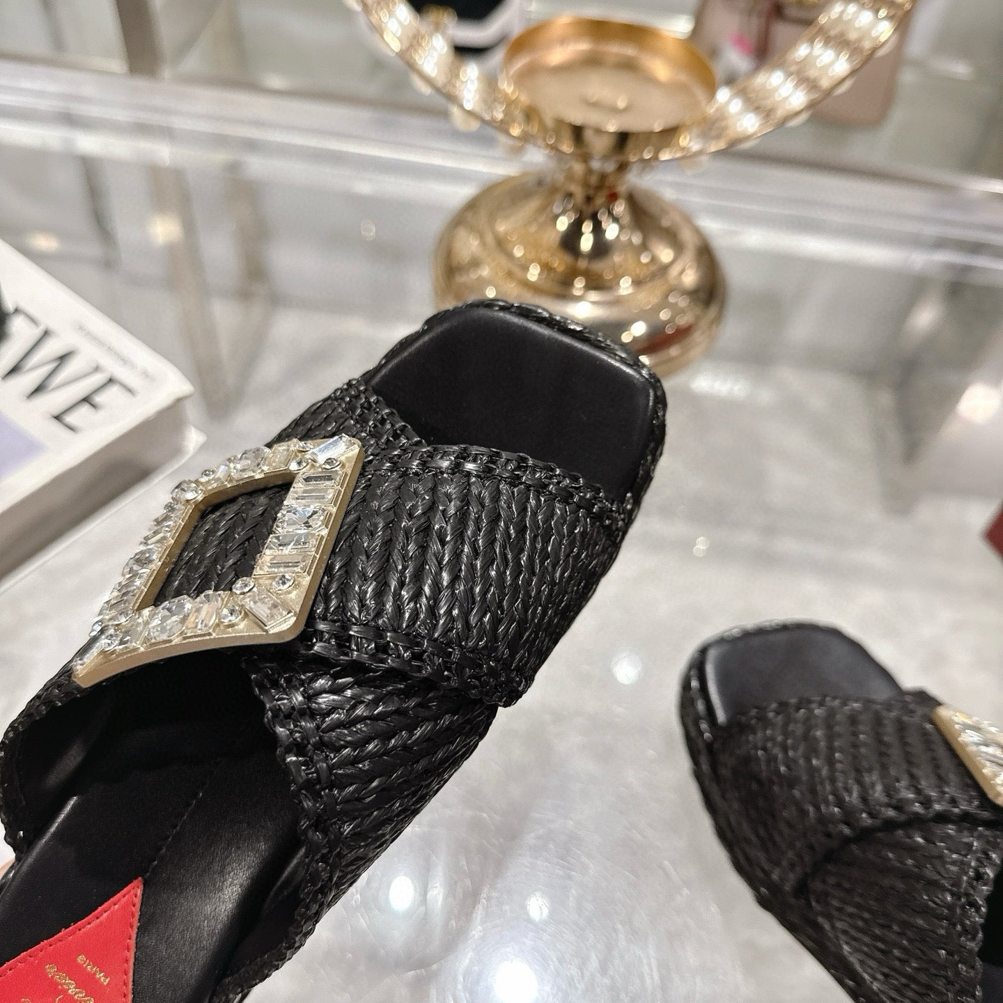 Viv 25 Hollow Square Buckle Slippers Black Weaving Leather 262999