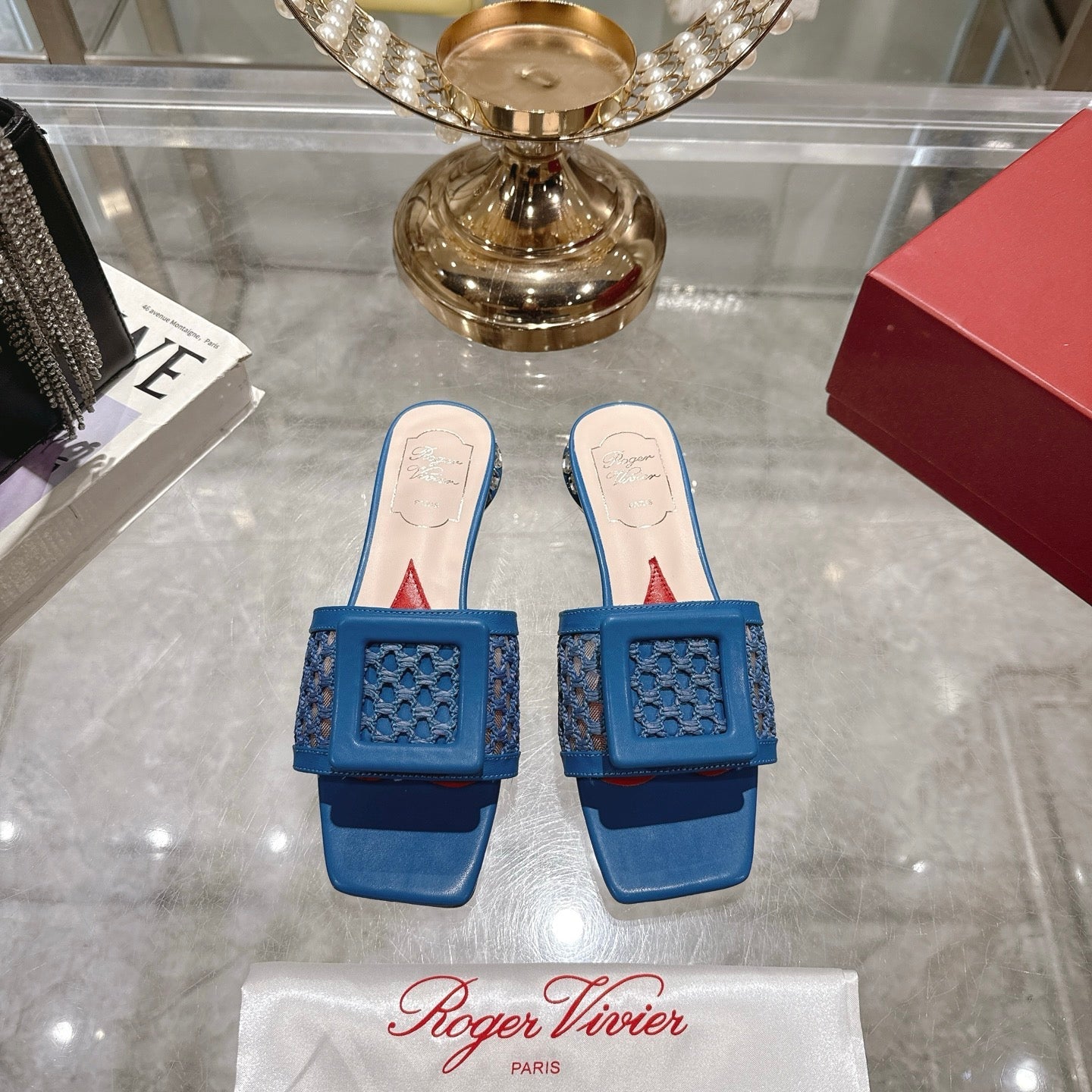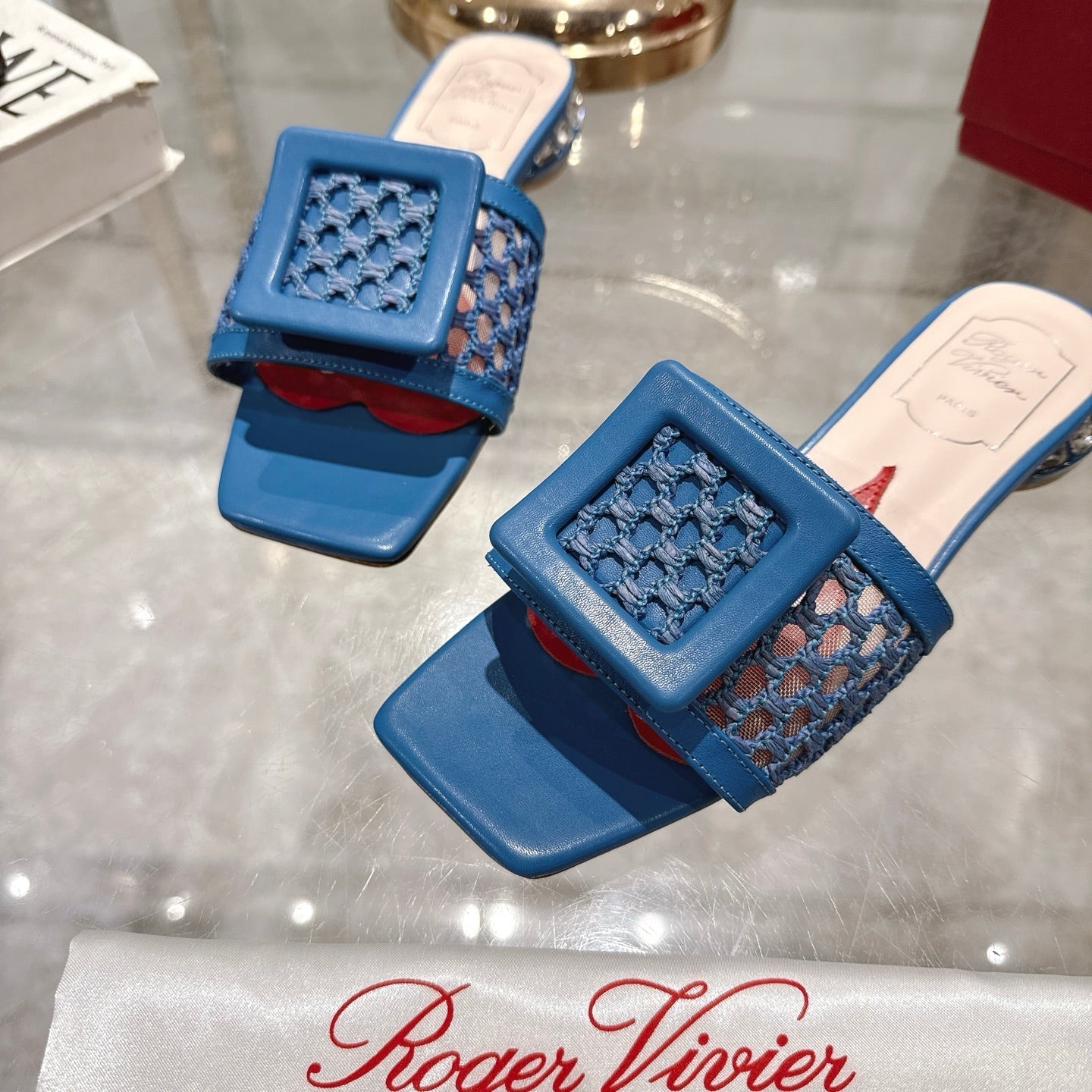 Viv 25 Hollow Square Buckle Slippers Blue Weaving Leather 263000