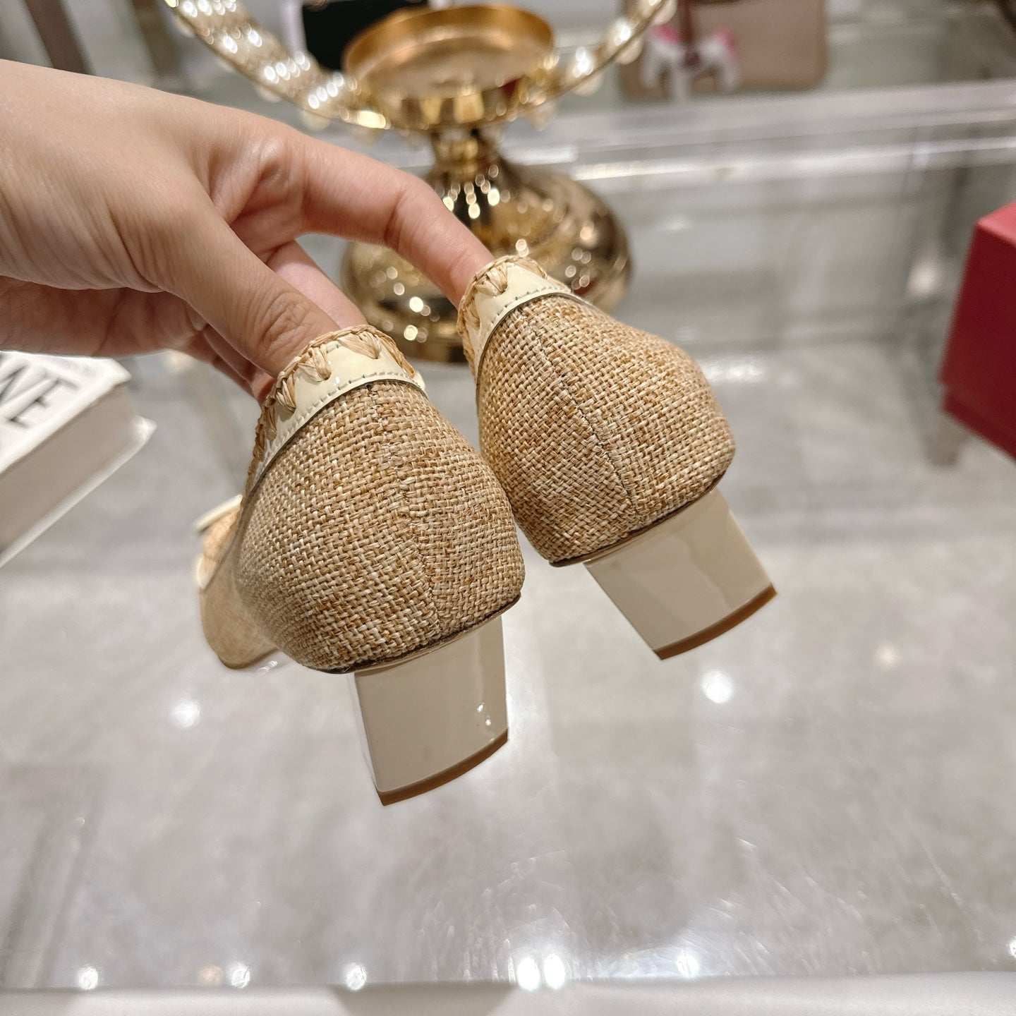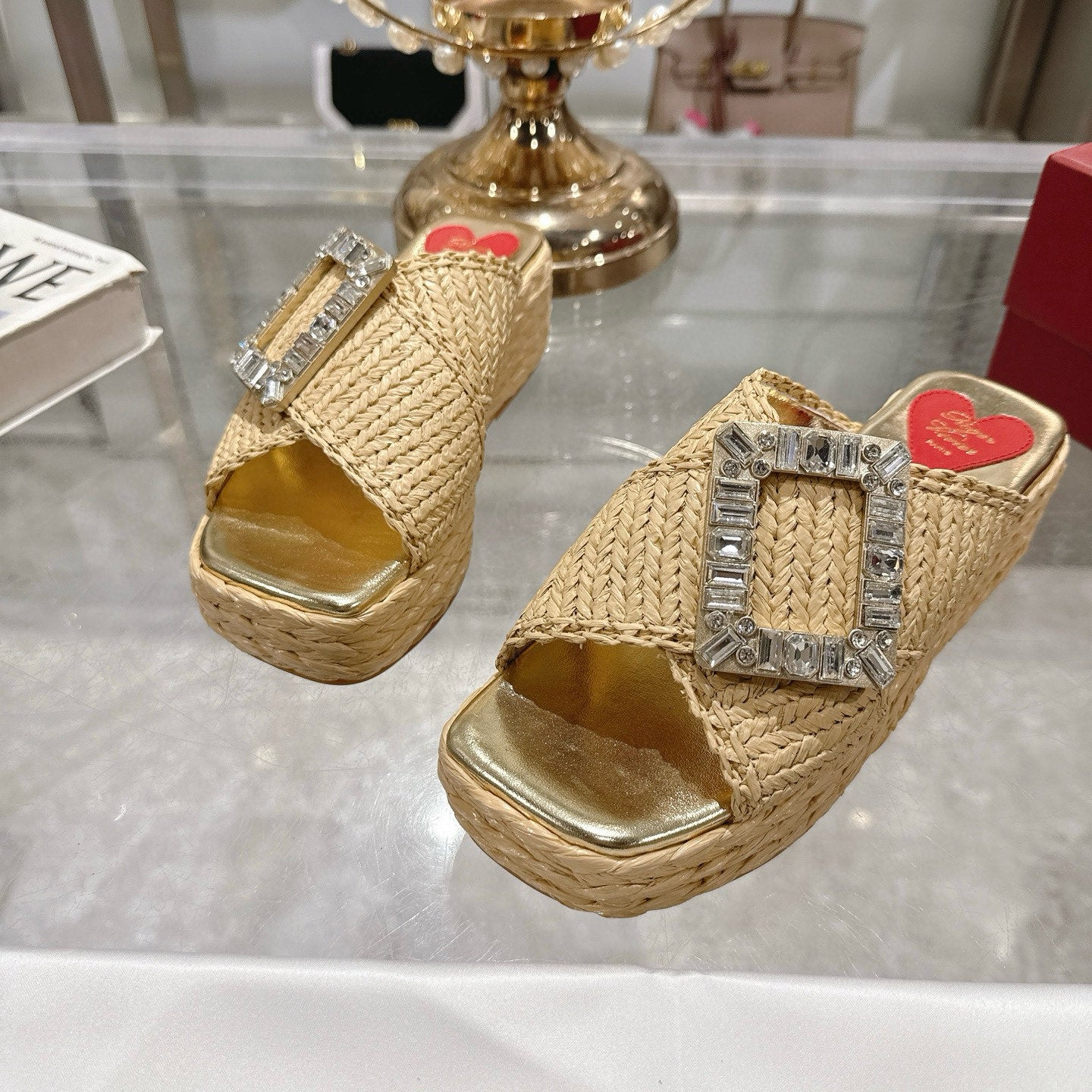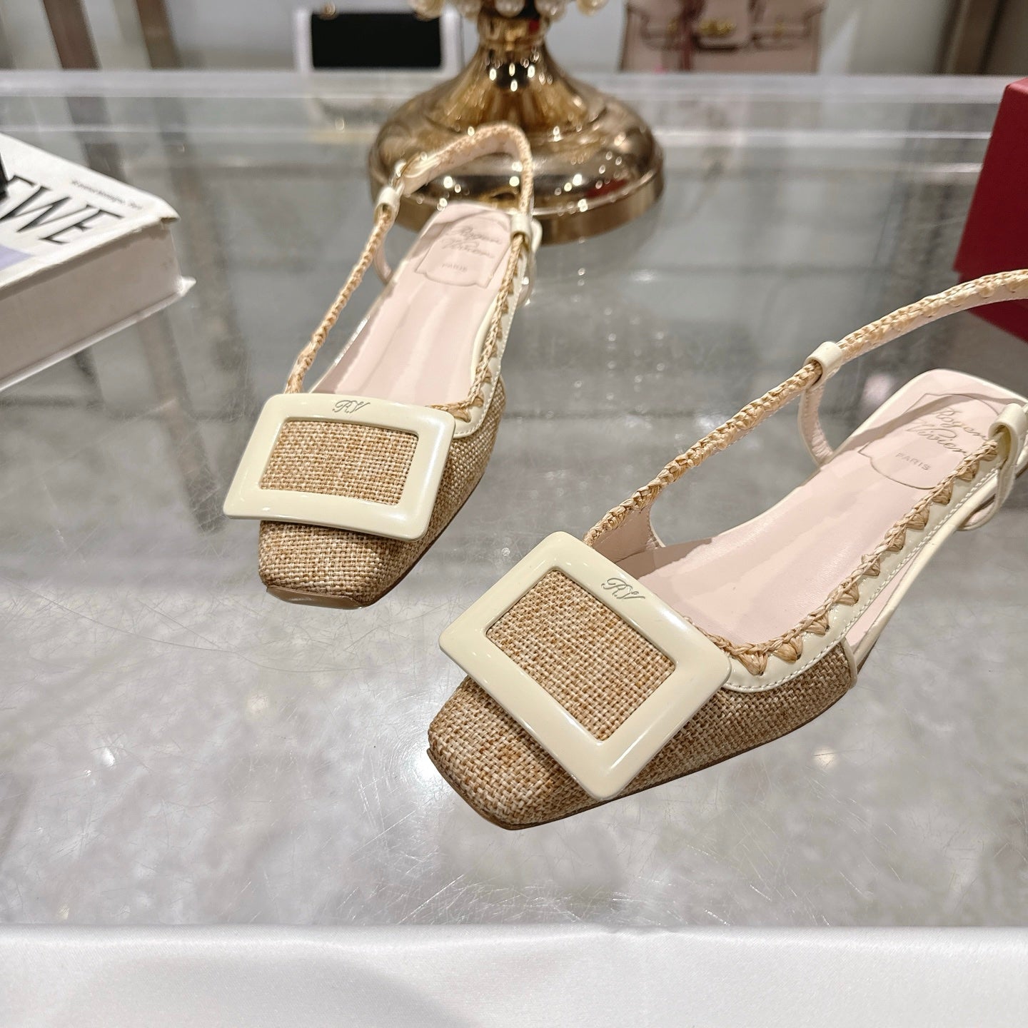 Viv 25 Hollow Square Buckle Slippers Gold Weaving Leather 263001