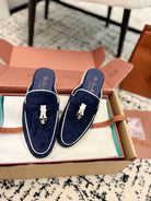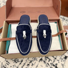 Loro Piana Navy White Suede Charms Walk Flat Mules