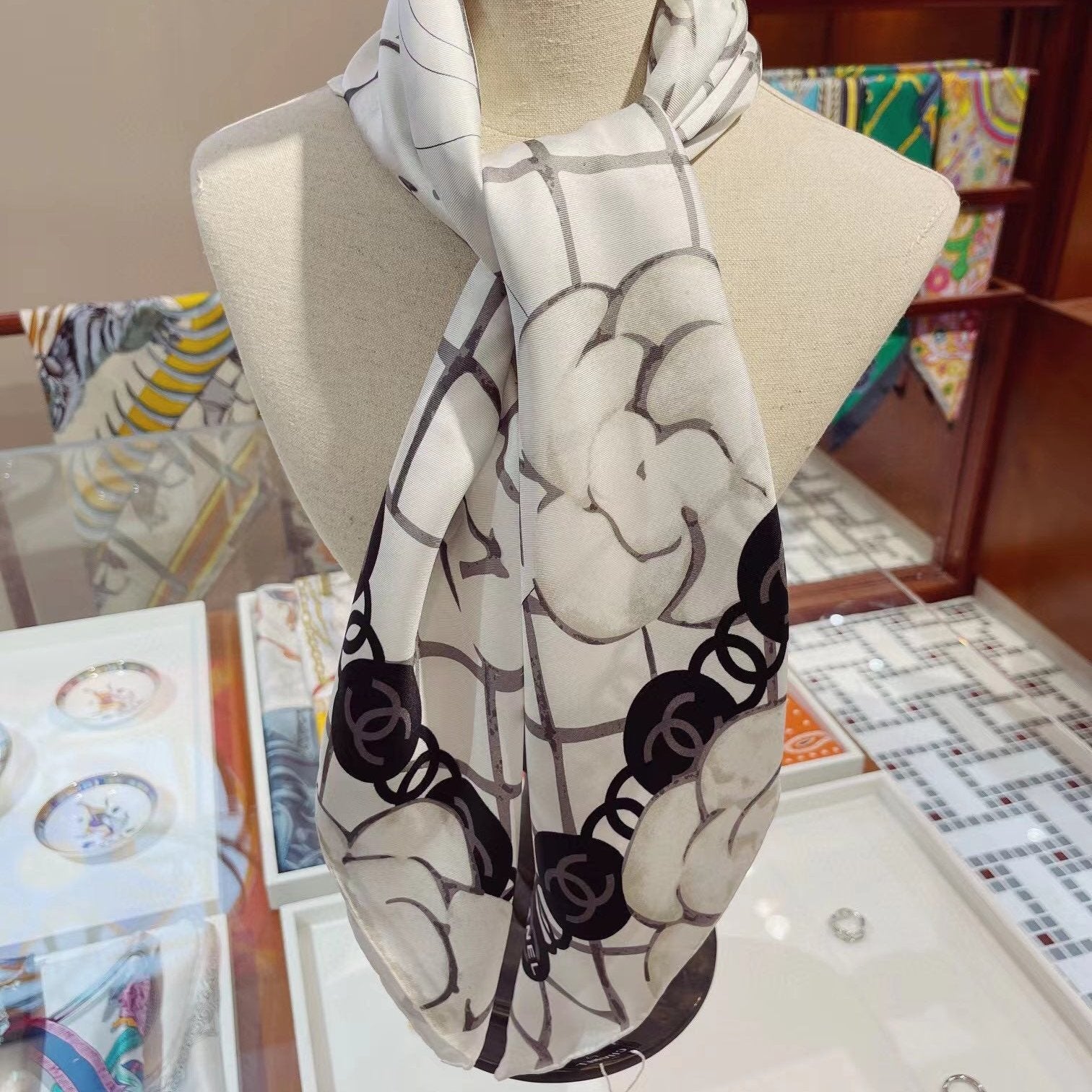 CC Square Scarf 90 CM In White Mix Black Camellia Print Silk Twill 288688