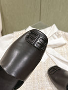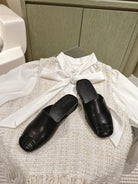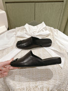 BLACK SHINY LAMBSKIN SQUARE TOE FLAT MULES BLACK BUCKLE