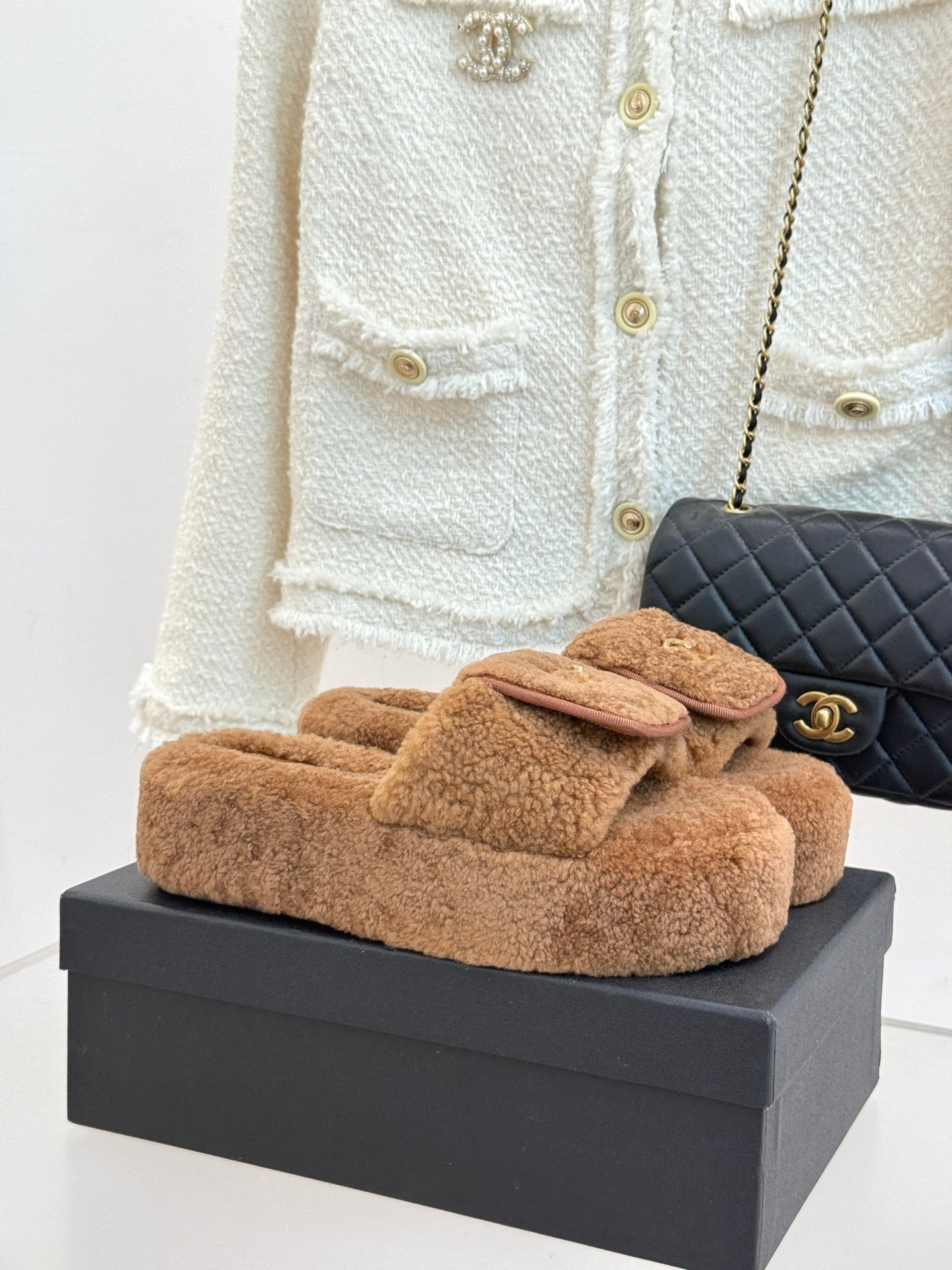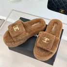 Chanel 25 Buckle Flip-up Thick-soled Slippers Brown Wool 465384