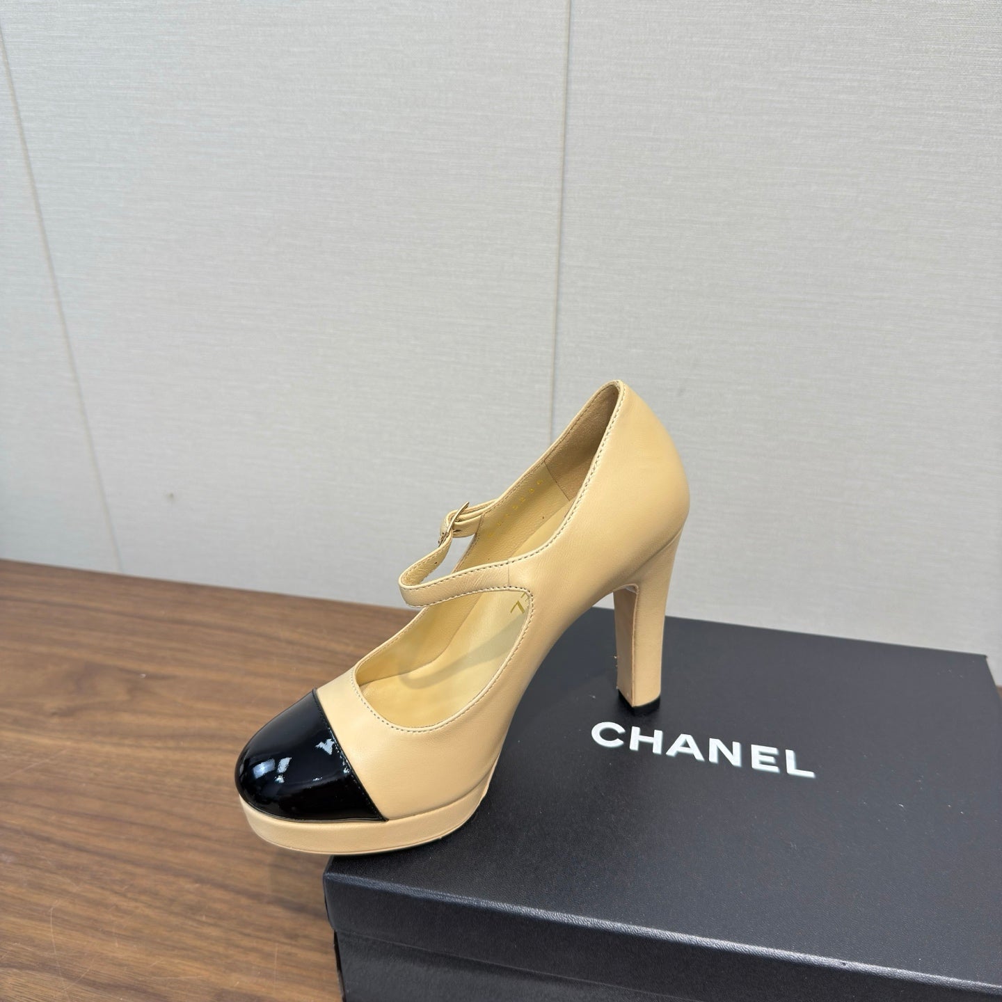 Chanel 25 High Heel Pump Beige Black Sheepskin 465593