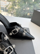 CRYSTAL BUCKLE BLACK WAX-OIL SHEEPSKIN HEELED MULES