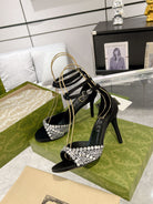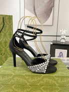 GG CRYSTAL BLACK HIGH HEEL SANDALS SATIN