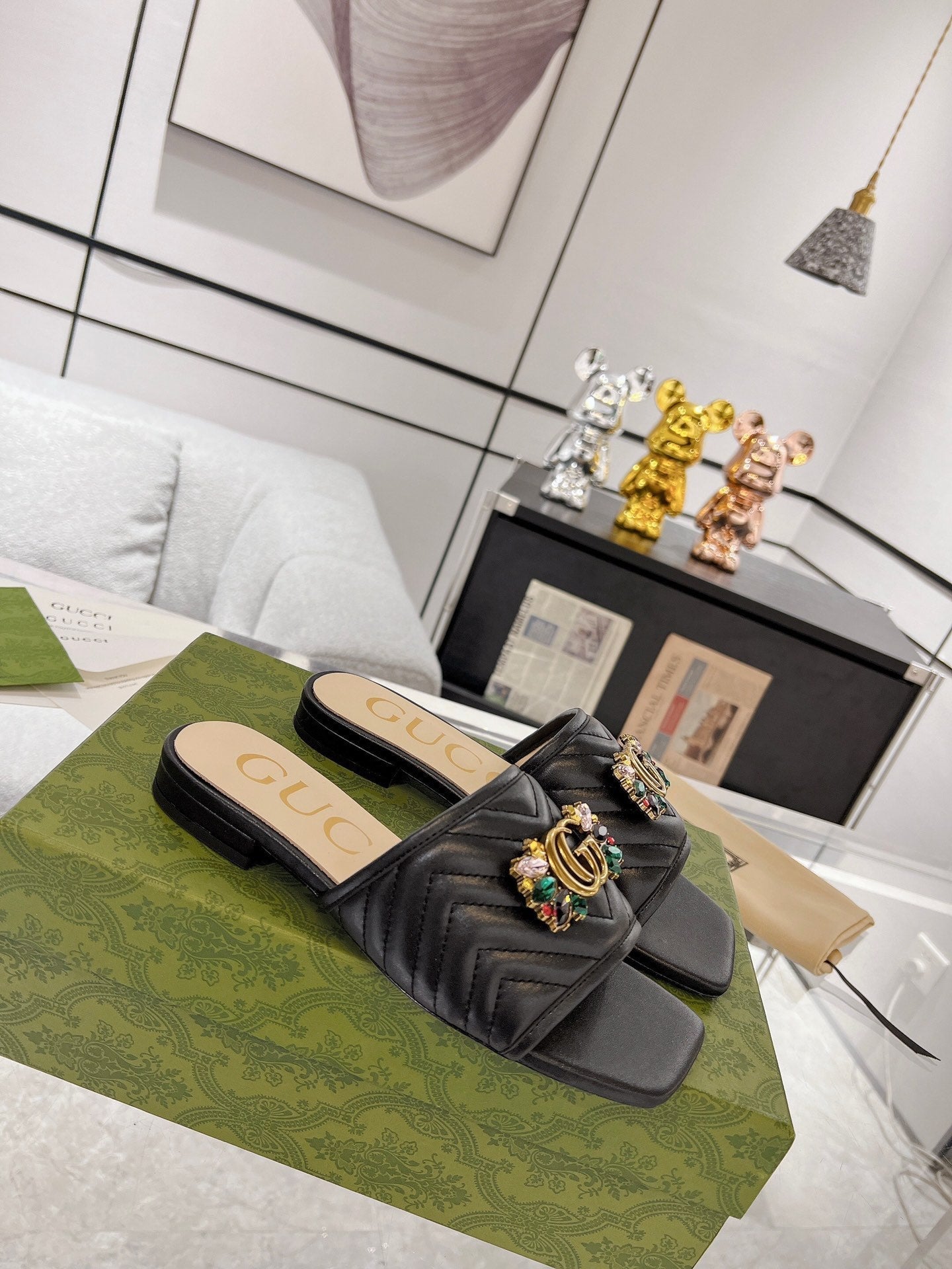 GG SPARKLE CRYSTAL SLIDE SANDAL BLACK CALFSKIN