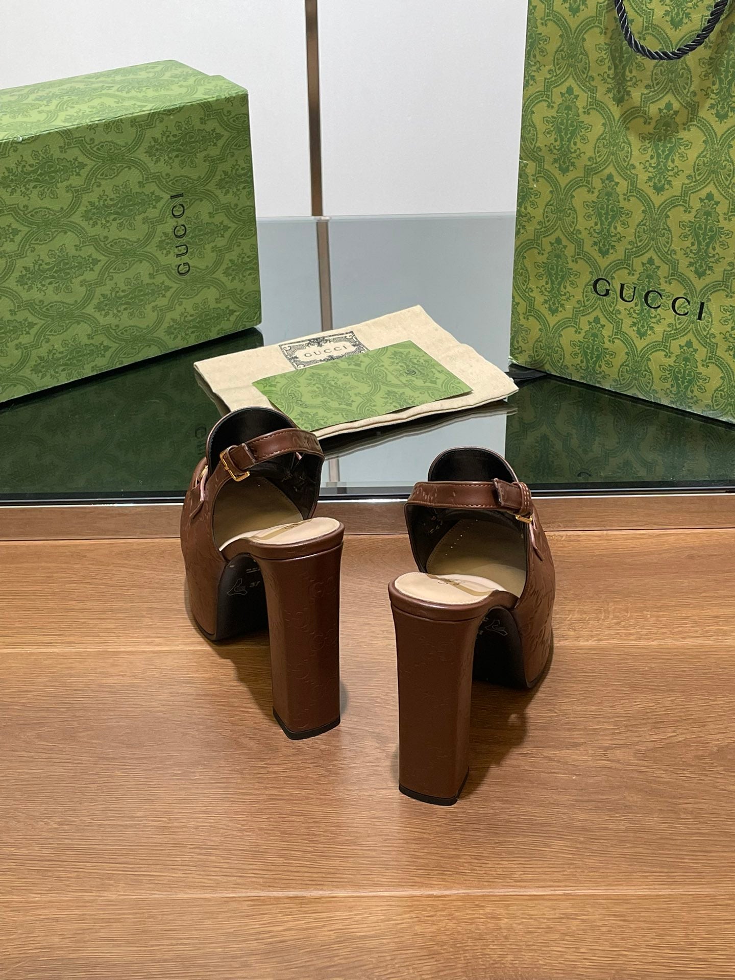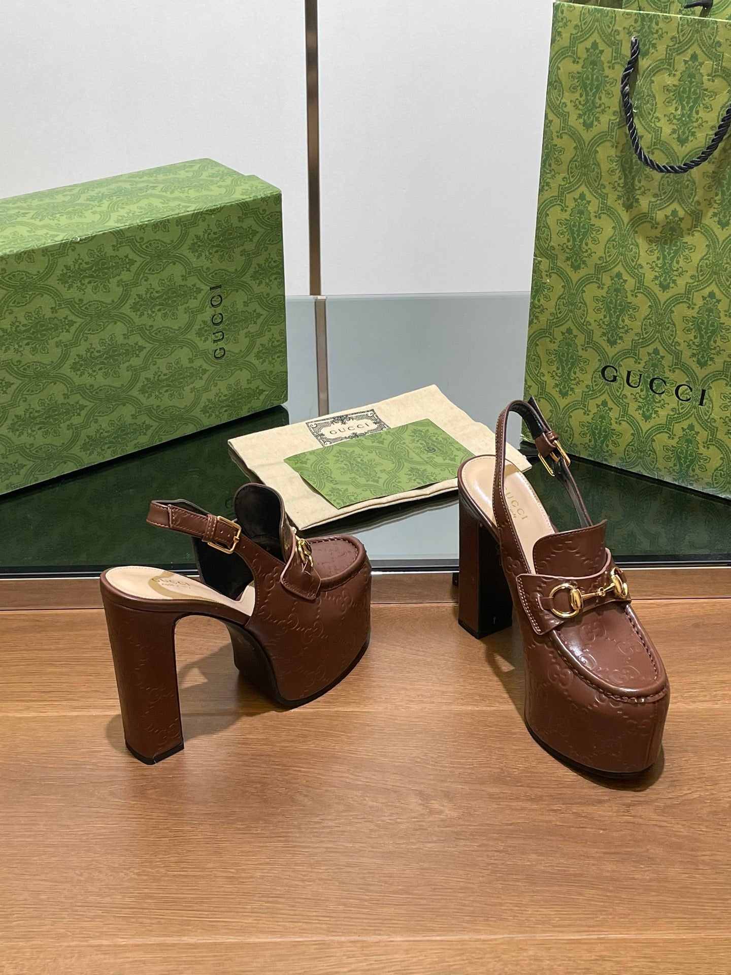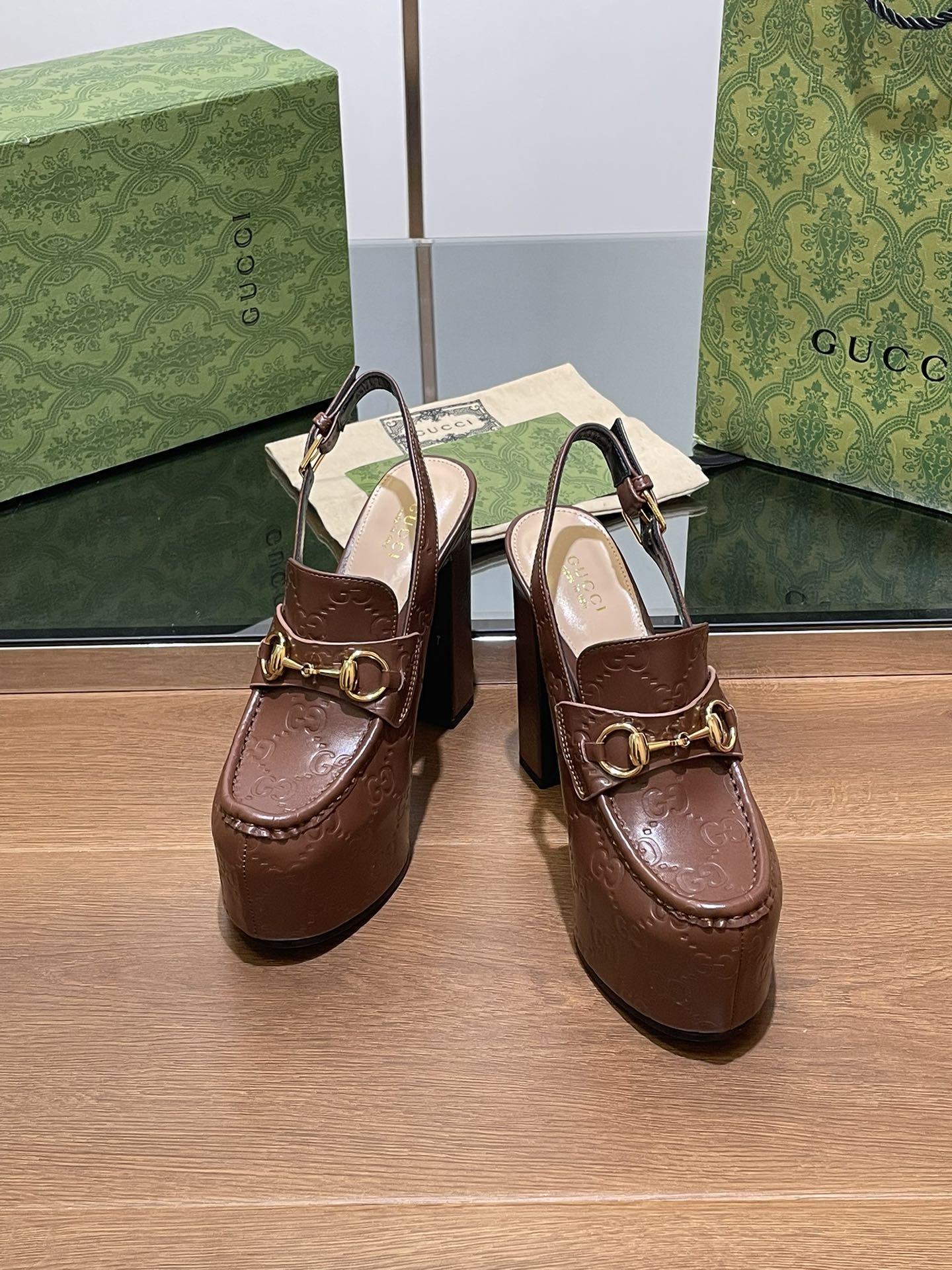 GG WOMEN'S HORSEBIT PLATFORM SLINGBACK IN DARK BROWN EMBOSSED CALFSKIN