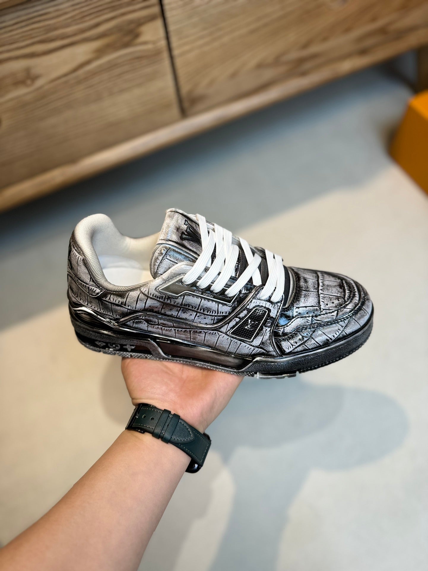 • Upper: "Stone grain cowhide, color-changing technique, with plastic logo on the upper and tongue of the shoe."