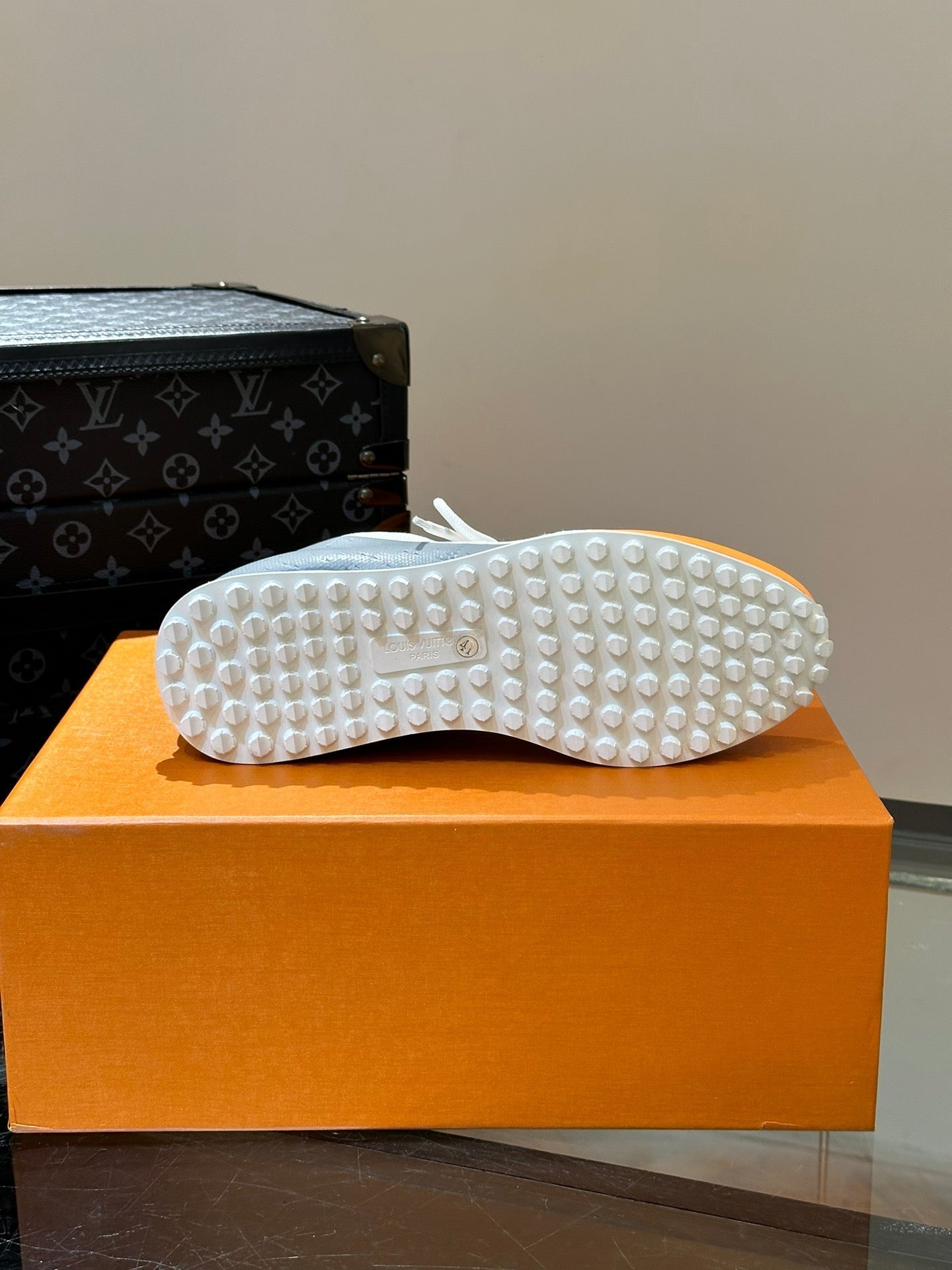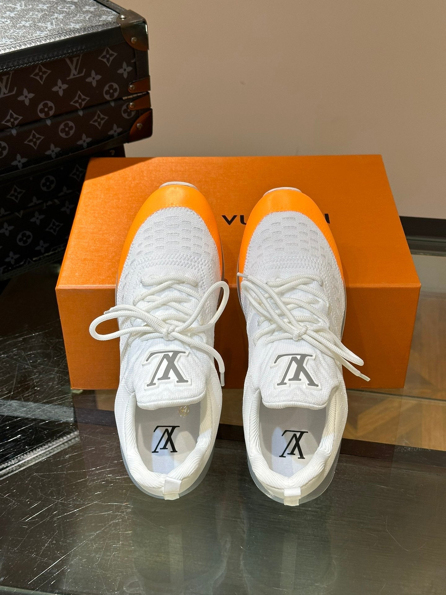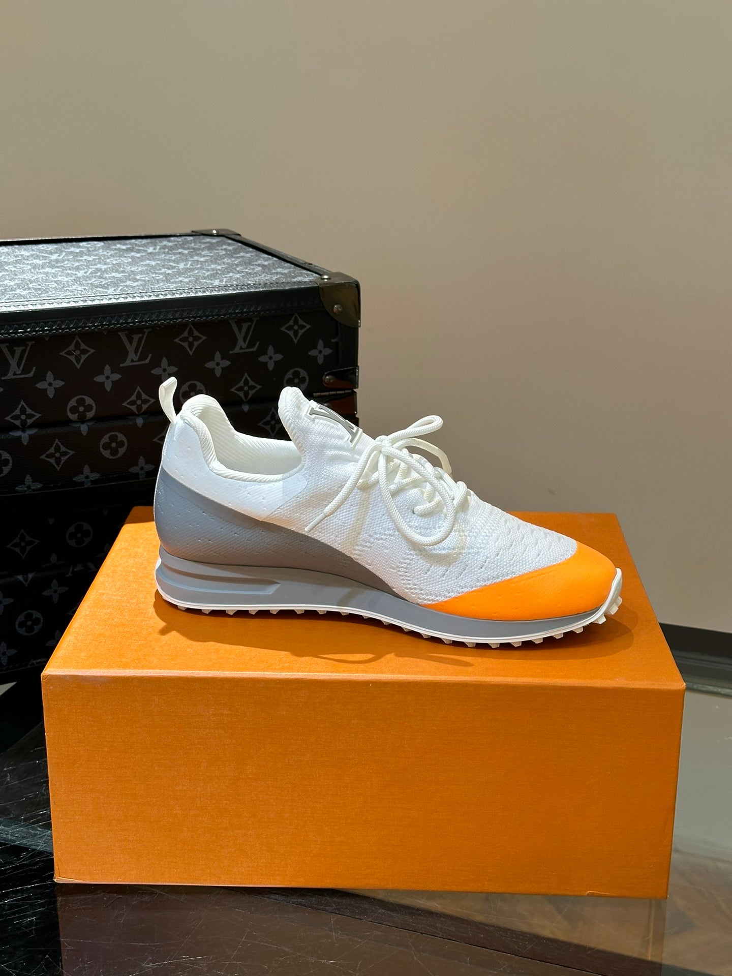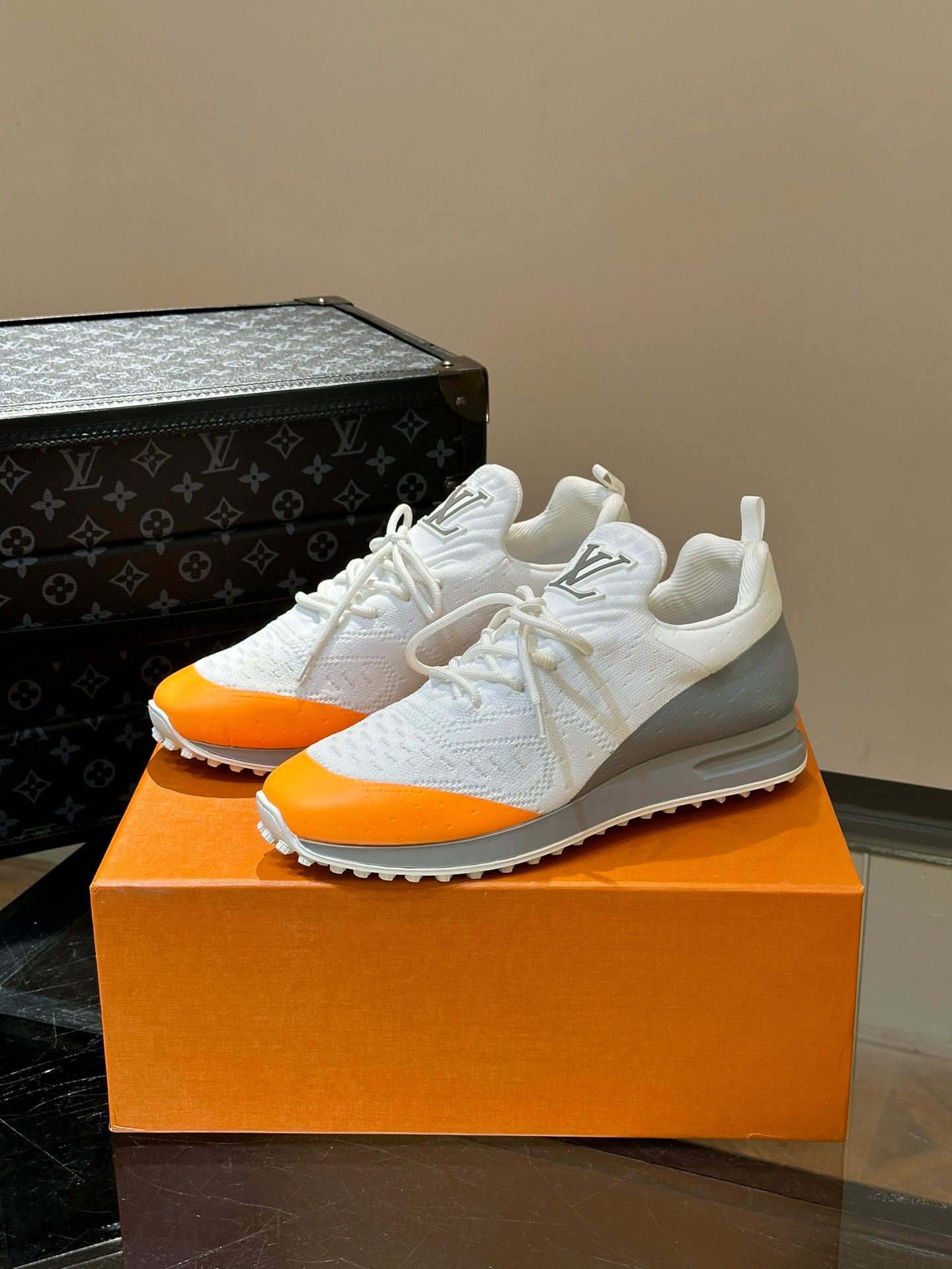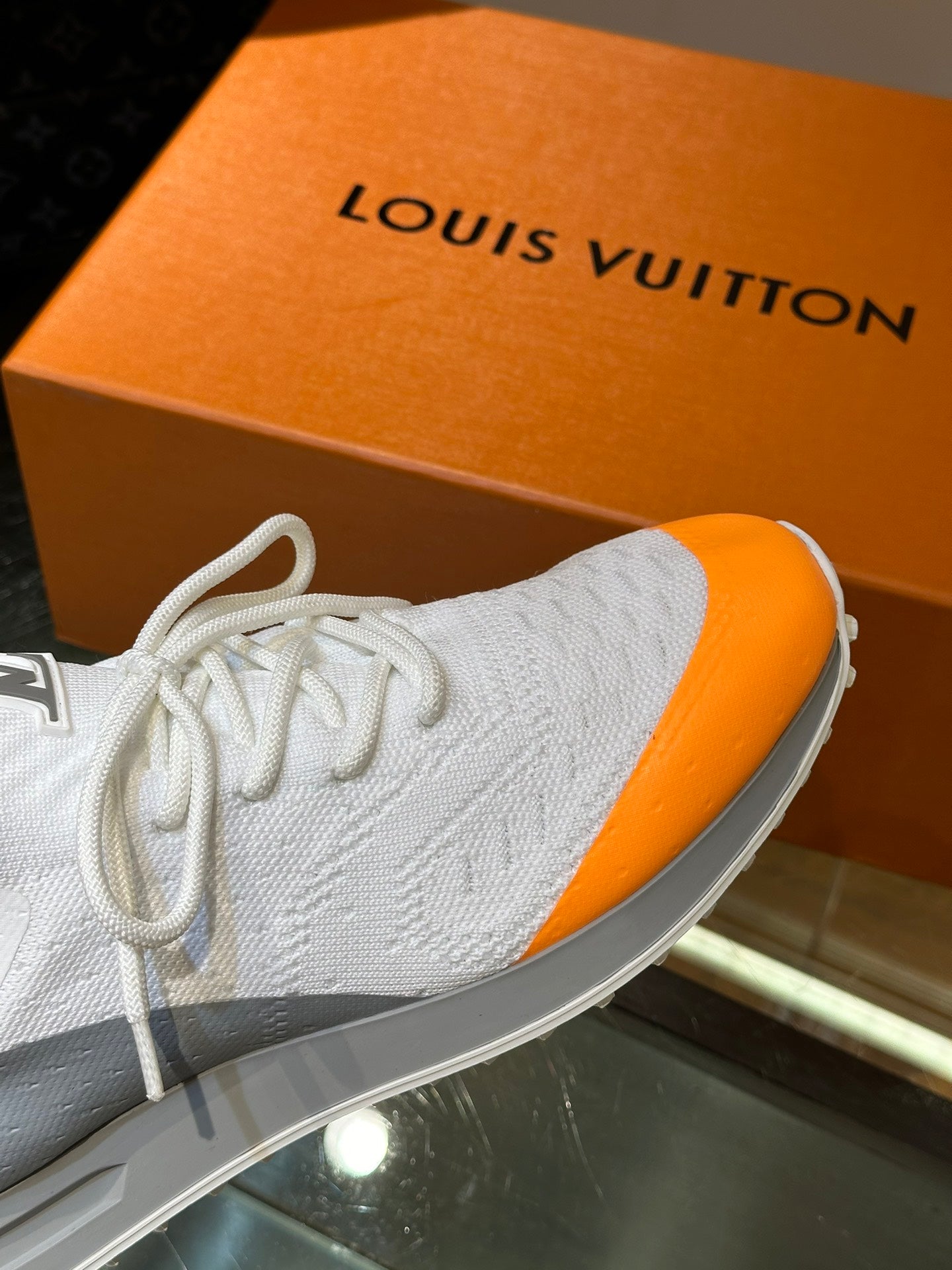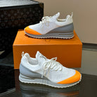 LV SNEAKERS IN GREY MIX WHITE MIX ORANGE CALFSKIN AND FABRIC BREATHABLE