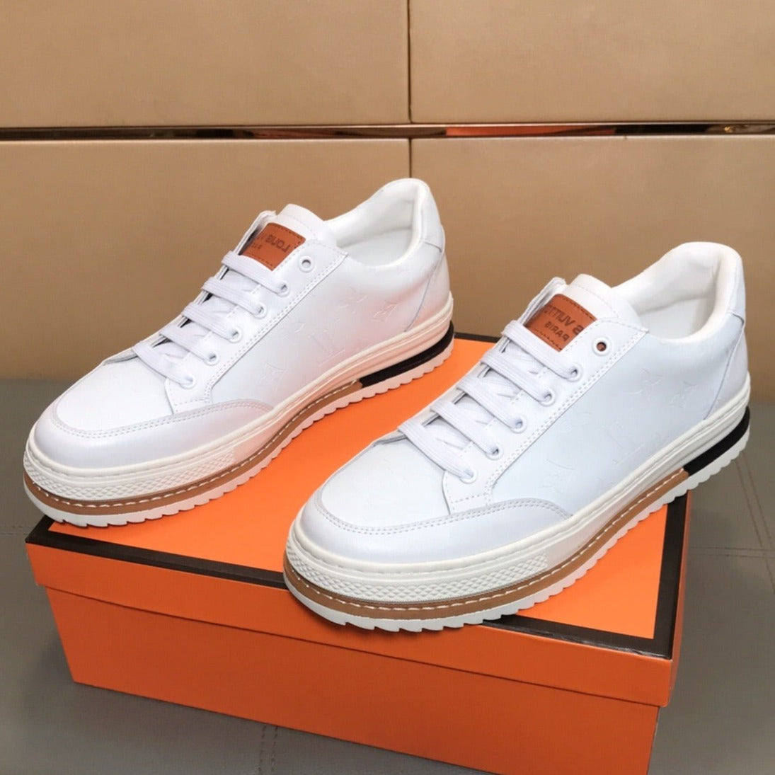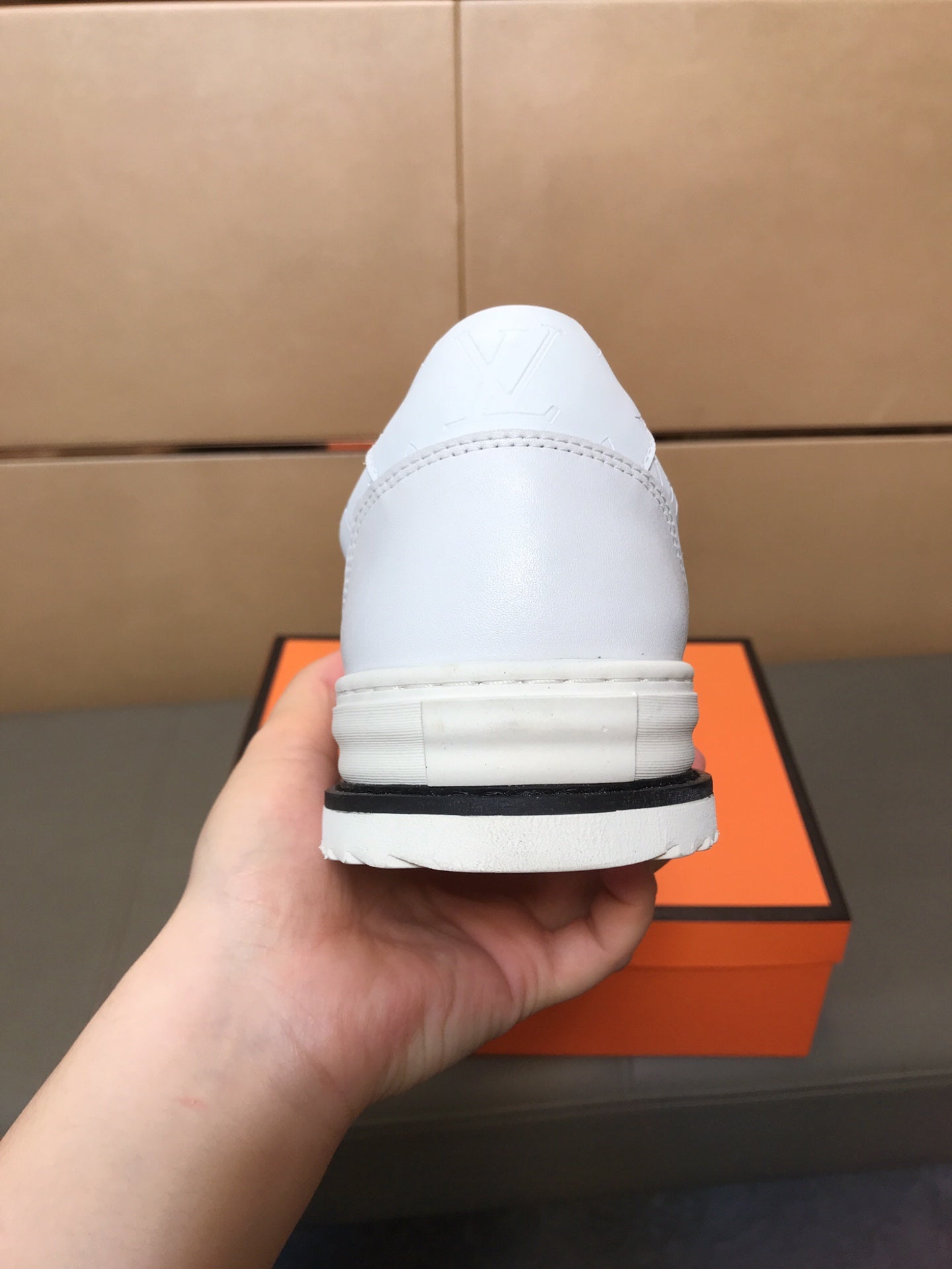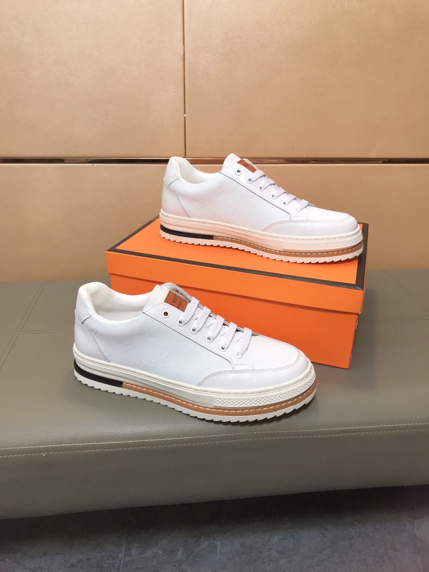 LV TRAINER IN EMBOSSED WHITE SUEDE