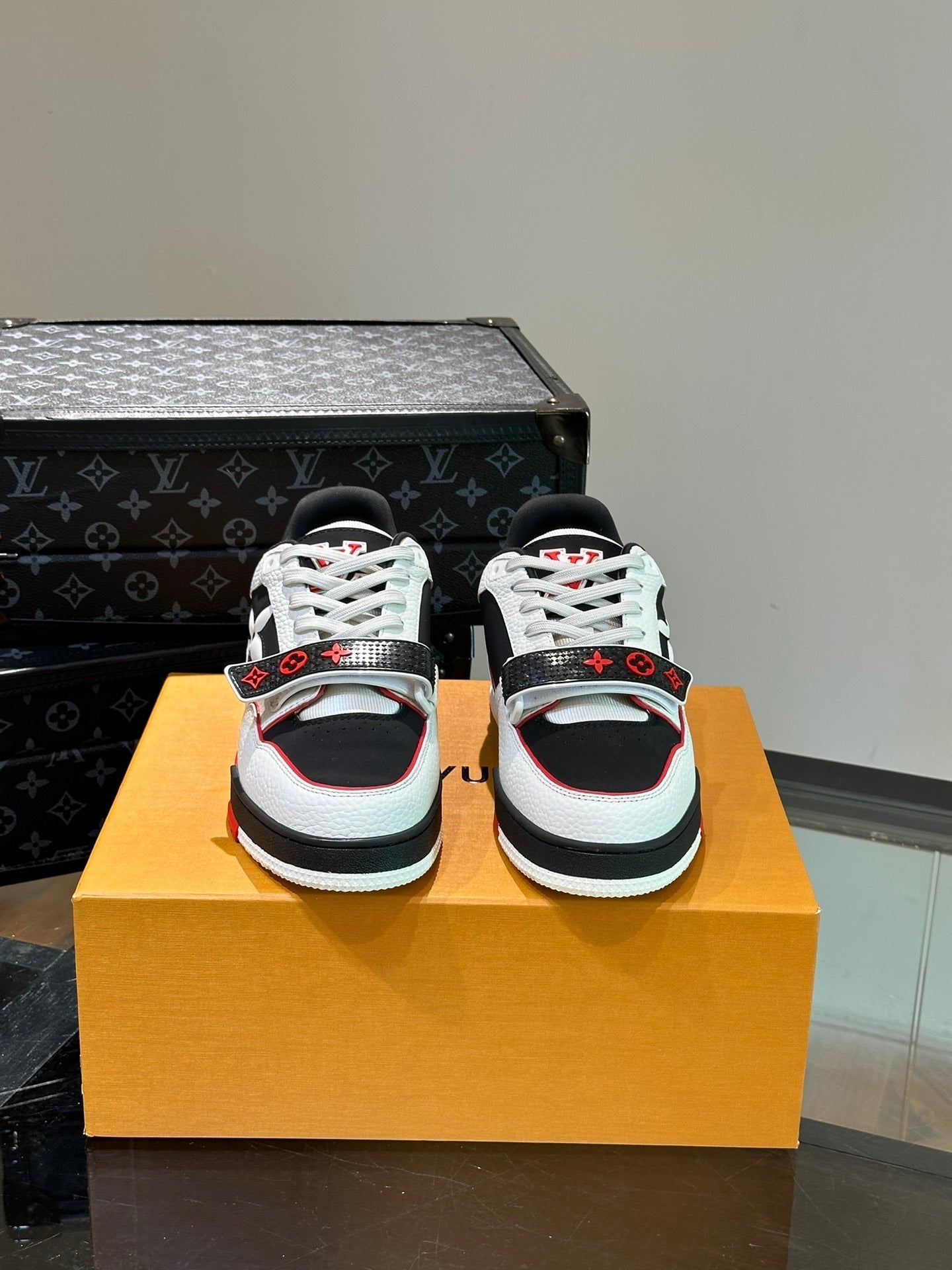 LV TRAINER SNEAKERS IN WHITE CALFSKIN AND BLACK MIX RED SUEDE