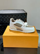LV TRAINER SNEAKERS IN WHITE CALFSKIN AND CAMEL BROWN SUEDE