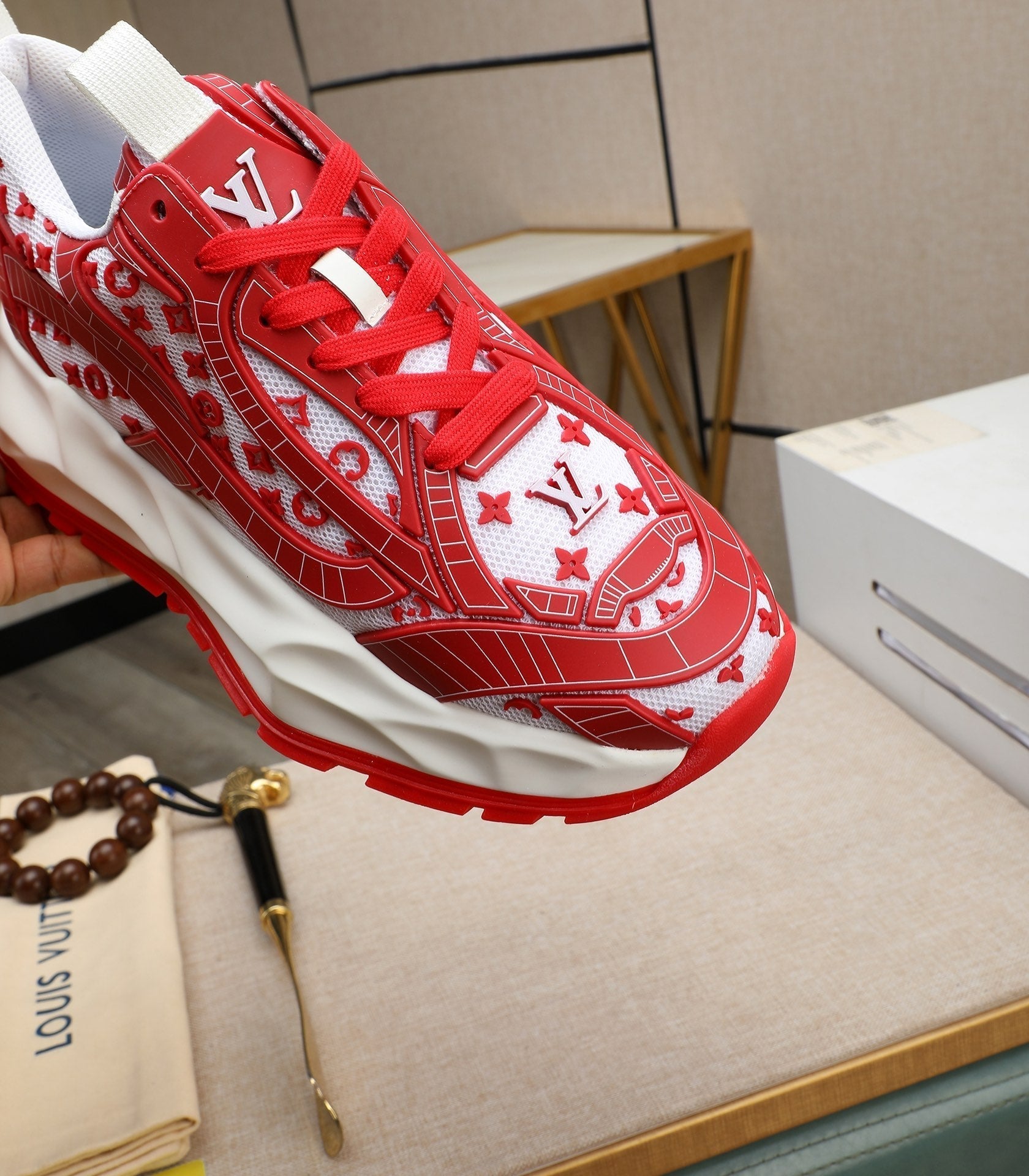 LV TRAINER WHITE MIX RED CALFSKIN AND BREATHABLE MESH