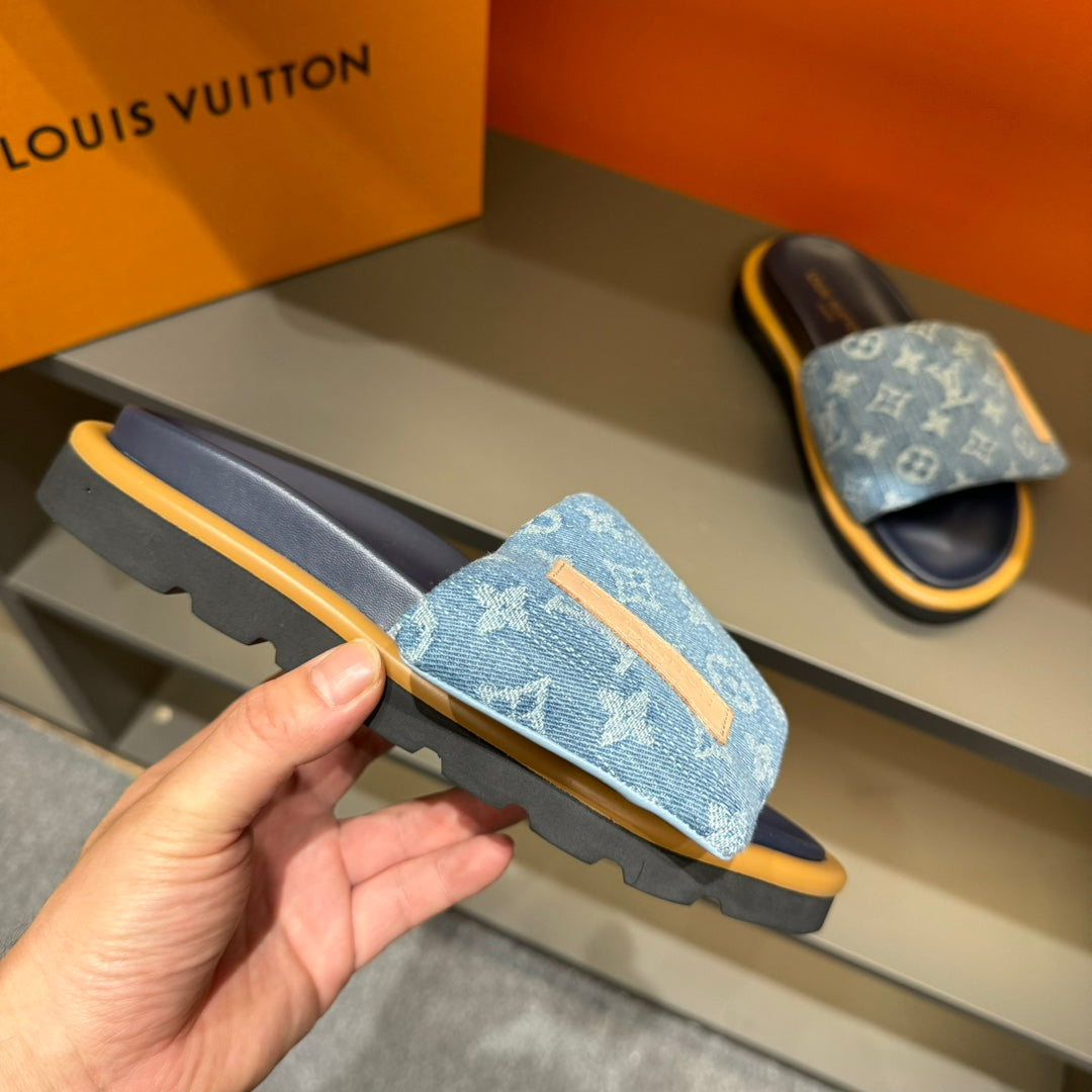 LV VELCRO SLIPPERS IN LIGHT BLUE MONOGRAM DENIM