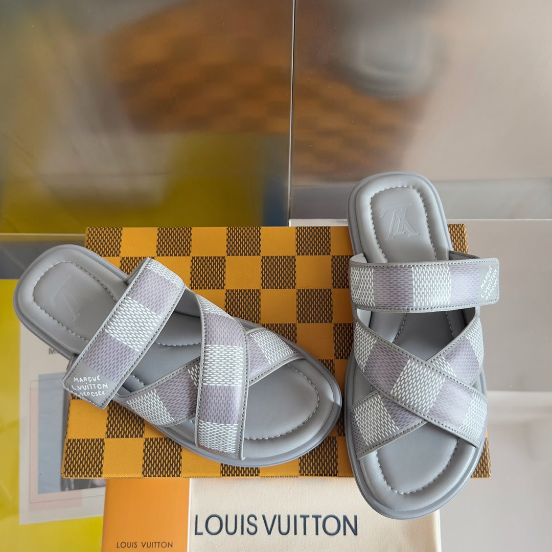 • Premium LV men's slippers, synchronizing with the 2024 early autumn runway collection. The slippers feature a high-quality fabric upper and an original, exclusive comfort sole, ensuring exceptional comfort. These are original factory-followed products.