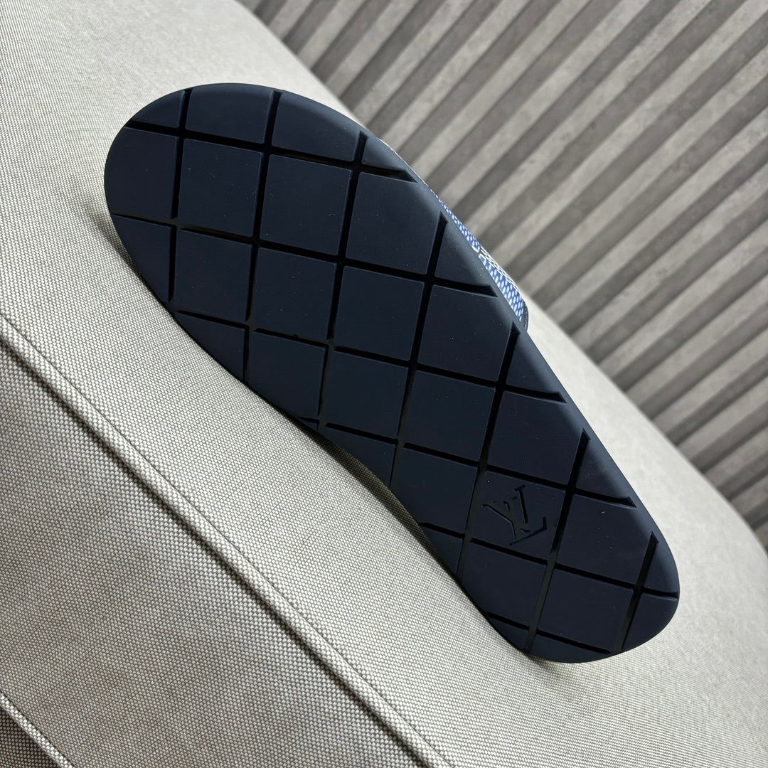 • Premium LV men's slippers, synchronizing with the 2024 early autumn runway collection. The slippers feature a high-quality fabric upper and an original, exclusive comfort sole, ensuring exceptional comfort. These are original factory-followed products.