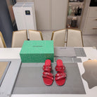 STRAPPY MEDIUM HEELED SANDALS IN RED STUDDED WAX-OIL SHEEPSKIN