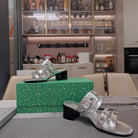 STRAPPY MEDIUM HEELED SANDALS IN SILVER STUDDED WAX-OIL SHEEPSKIN