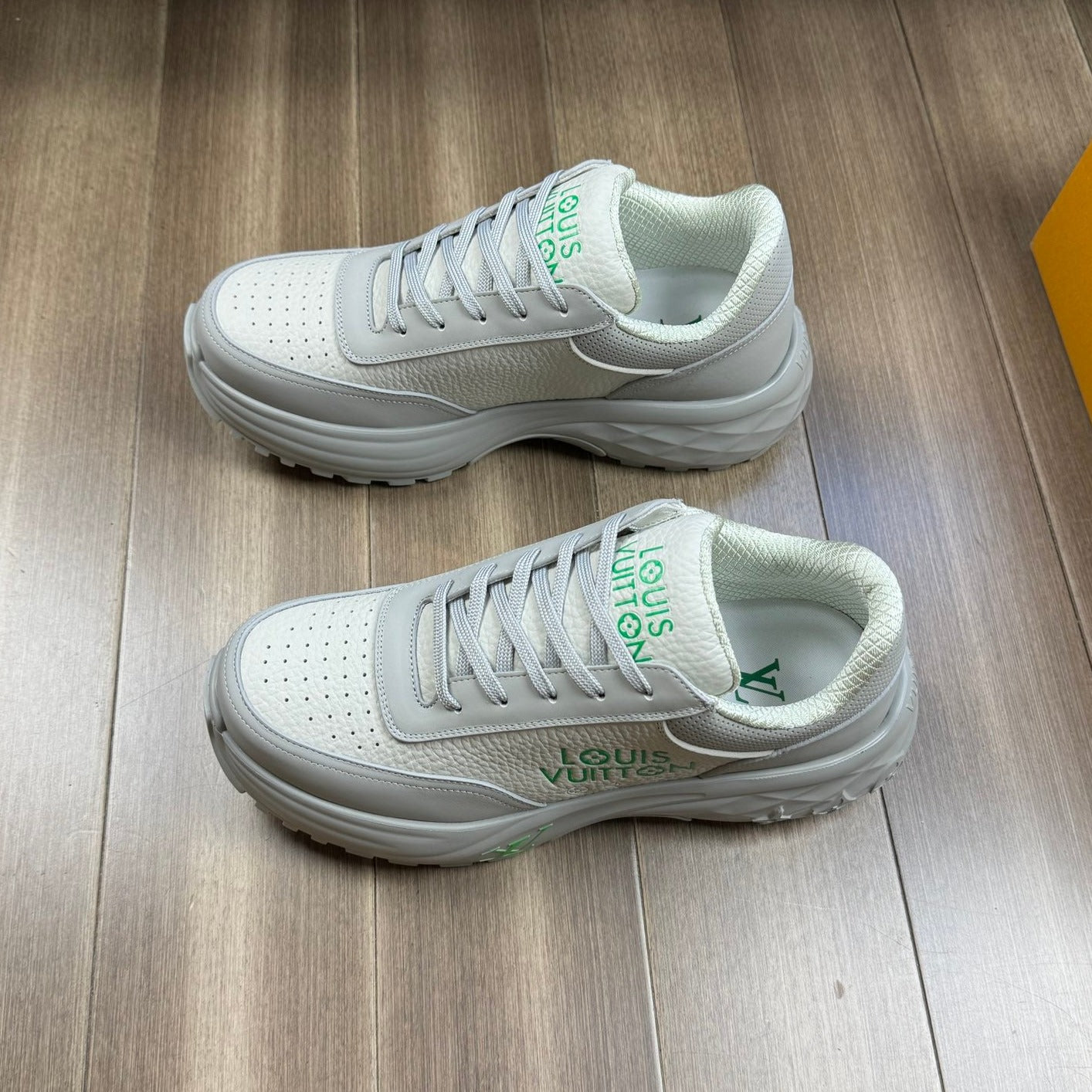 LV SPORT SNEAKER IN WHITE MIX GREY CALFSKIN WITH GREEN LOGO