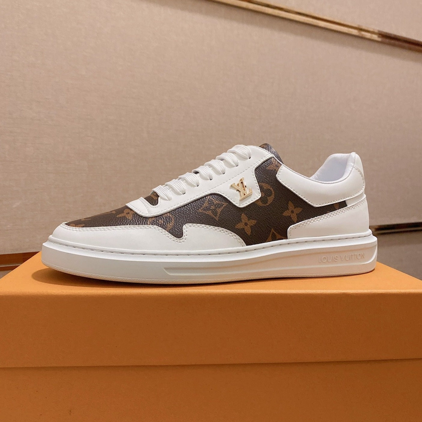 LV TRAINER SNEAKER WHITE CALFSKIN MIX CAMEL BEIGE SUEDE