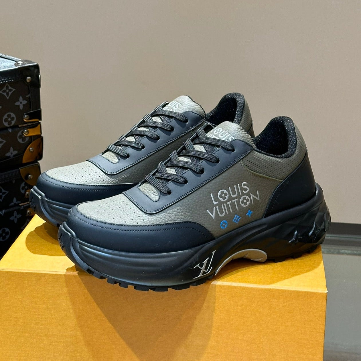 LV SNEAKERS IN GREY MIX BROWN CALFSKIN AND BRANDED PRINTED FABRIC
