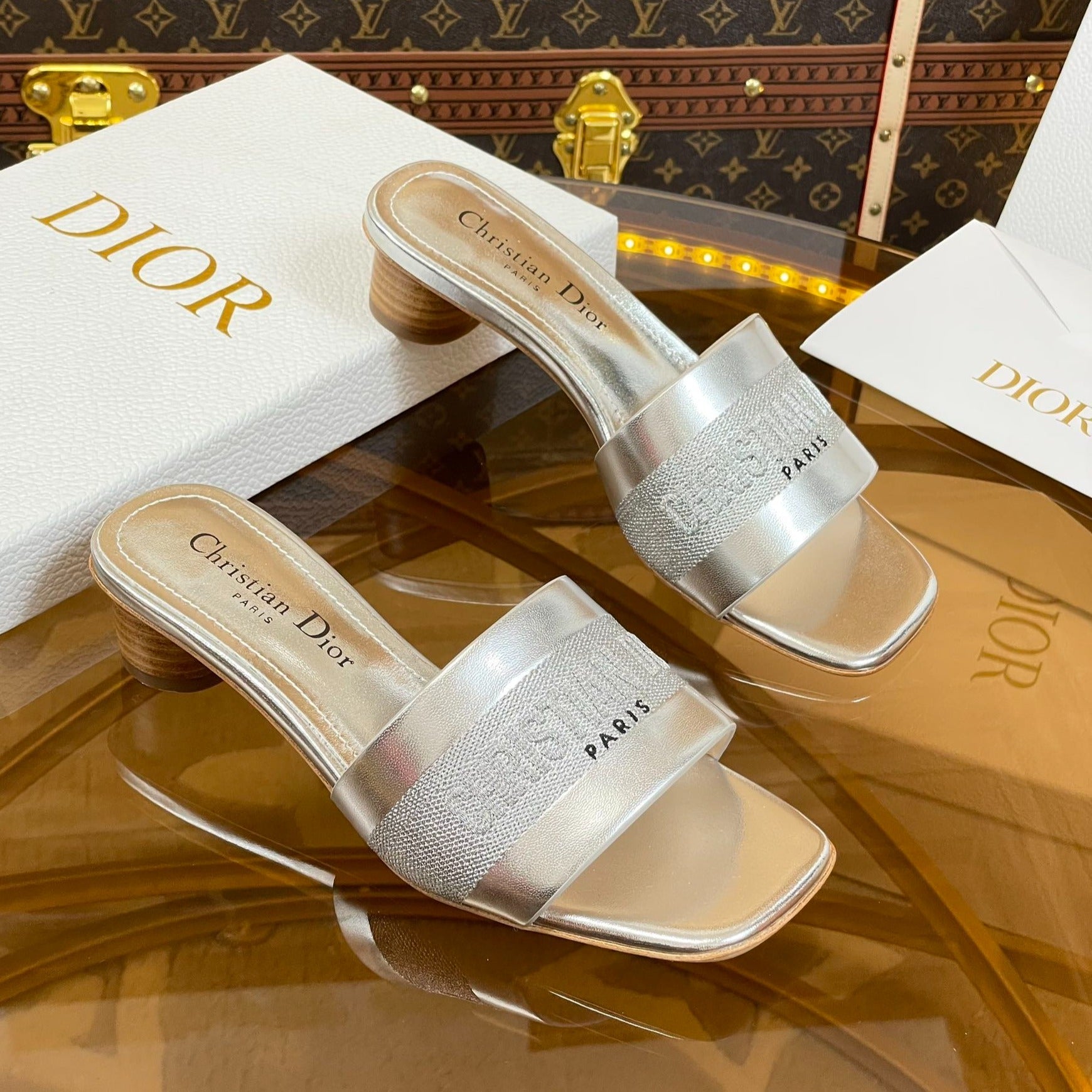 cd slide 45 silver metalic calfskin embroidered cotton