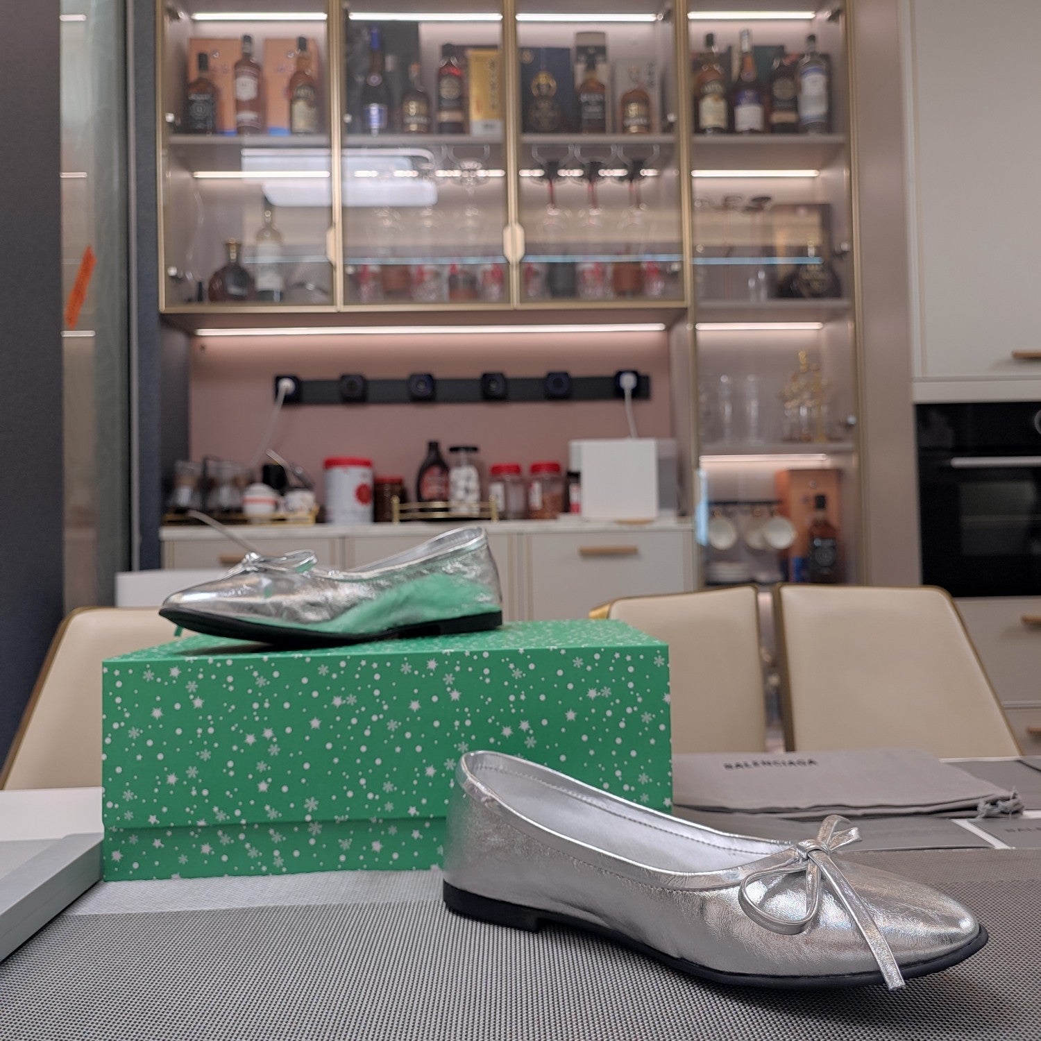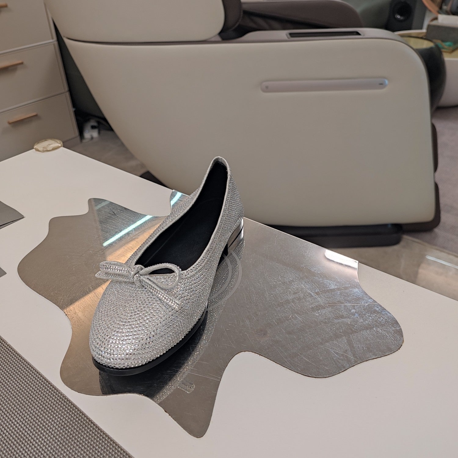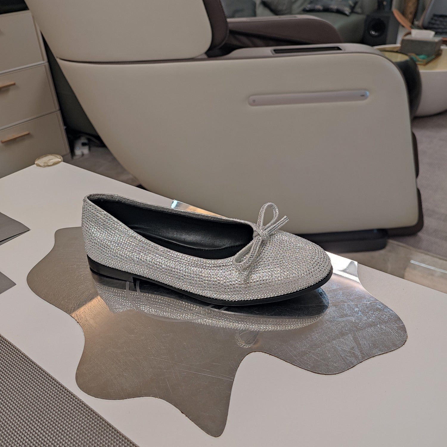 RHINESTONE BALLET FLATS WITH BOW IN METALLIC SILVER SHEEPSKIN