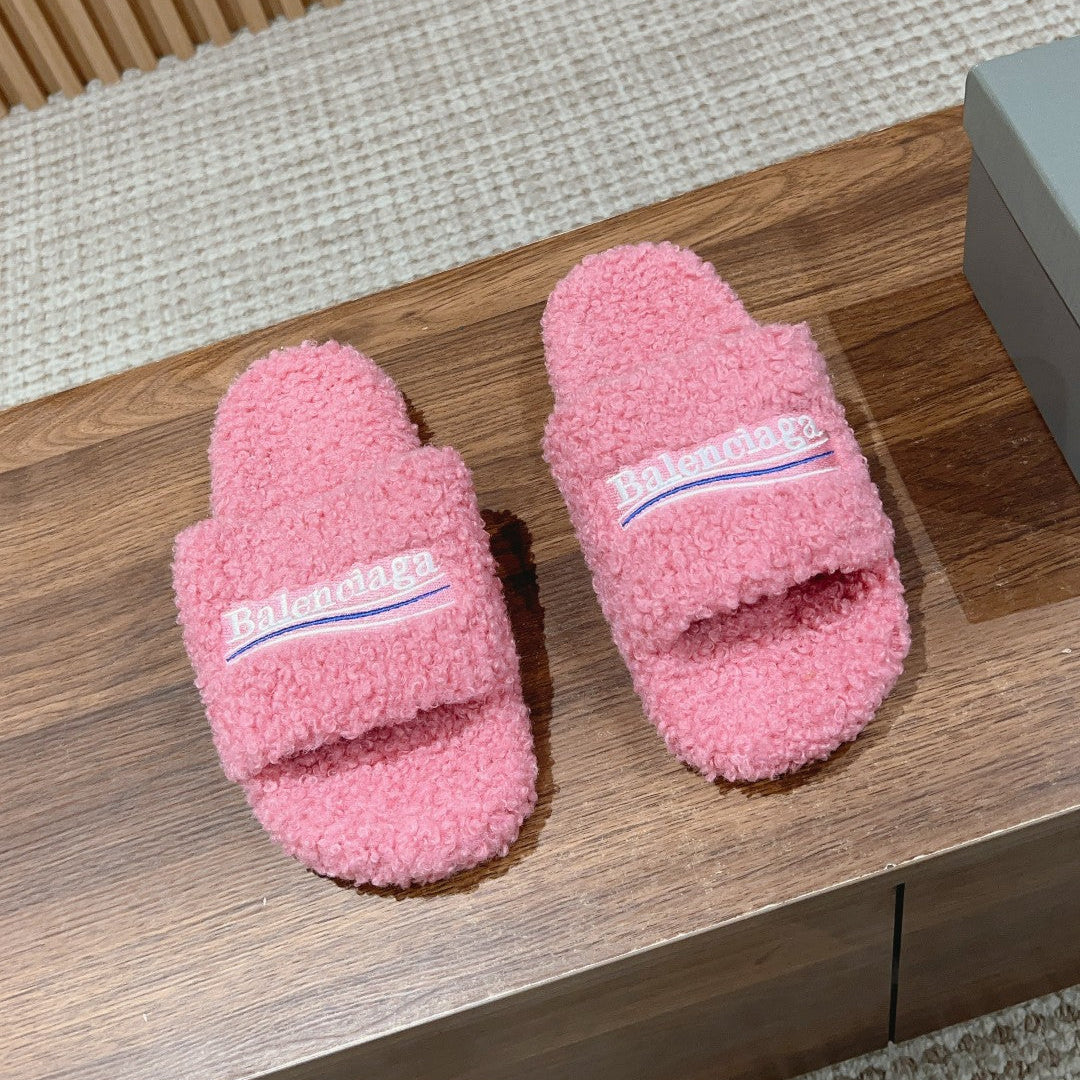 FURRY SLIDES IN PINK CURLY SHEARLING