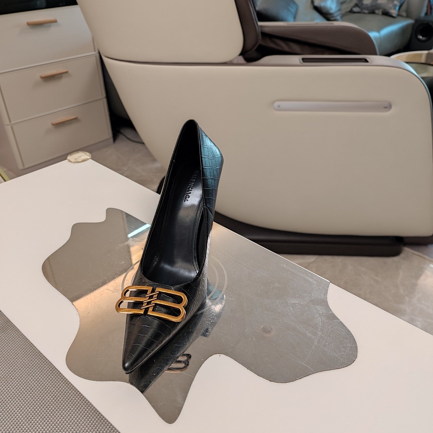 POINTED BB GOLD BUCKLE HIGH PUMPS IN BLACK CROCODILE PATTERN CALFSKIN