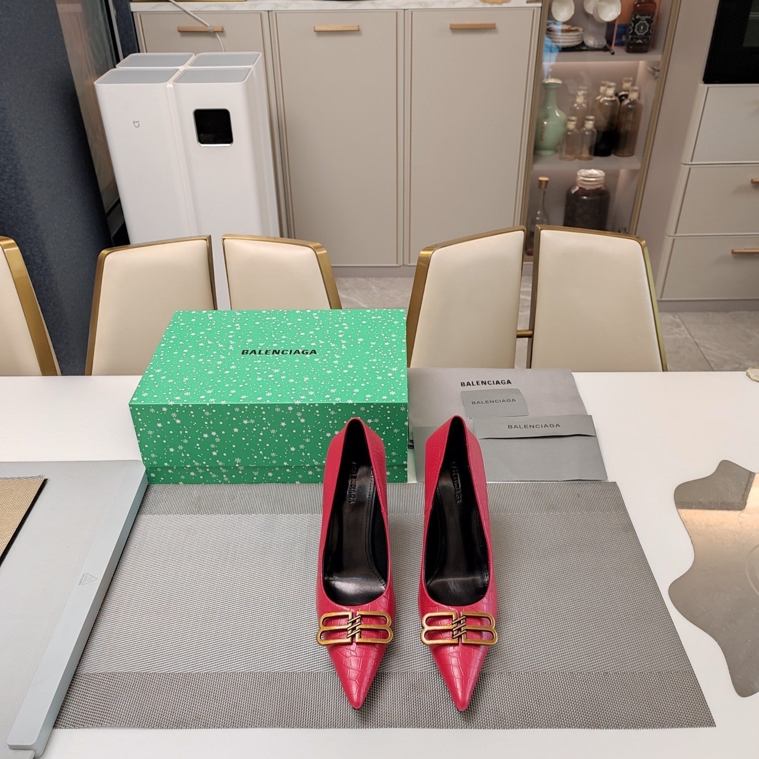 POINTED BB GOLD BUCKLE HIGH PUMPS IN RED CROCODILE PATTERN CALFSKIN