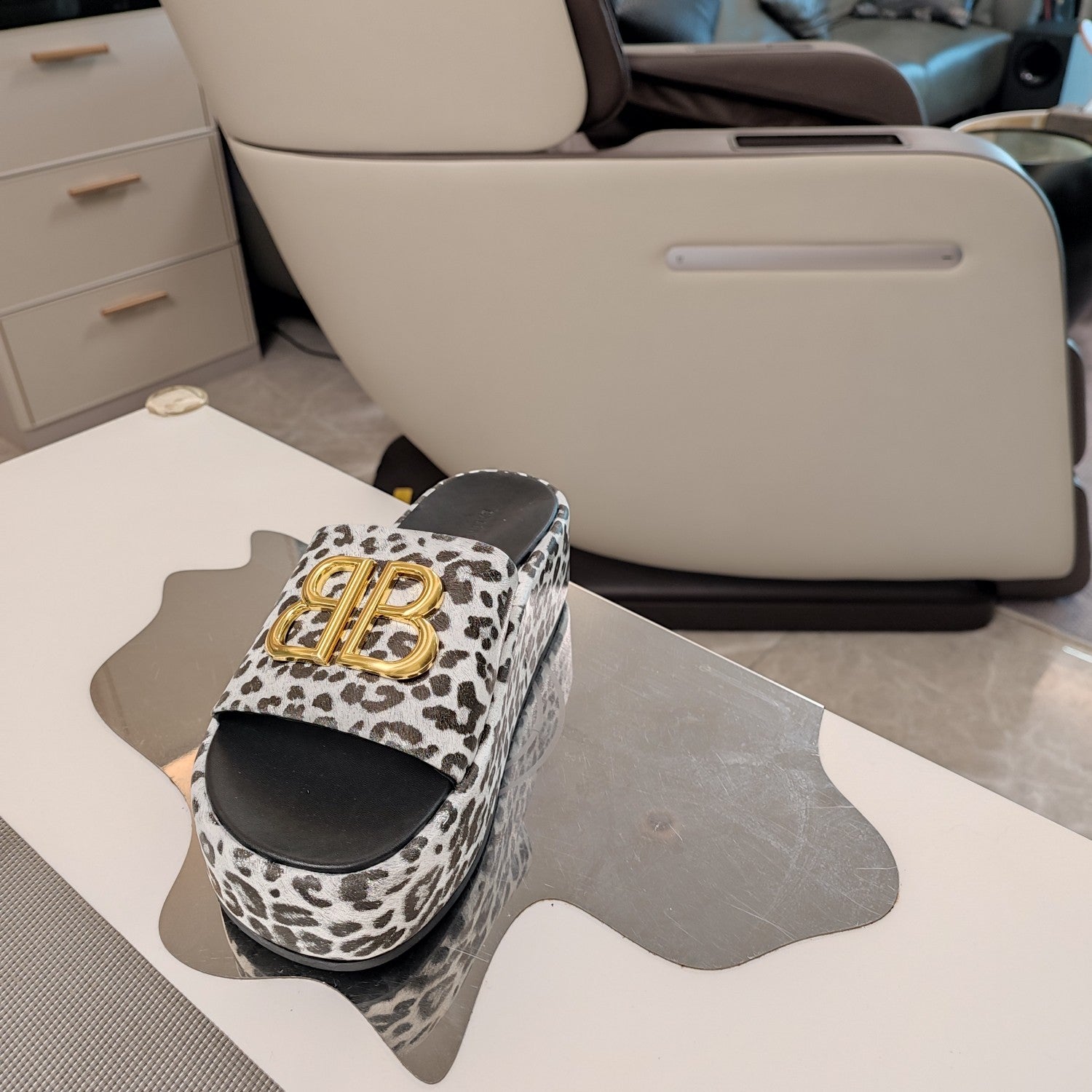 FURRY SLIDES IN LEOPARD PRINT RABBIT FUR