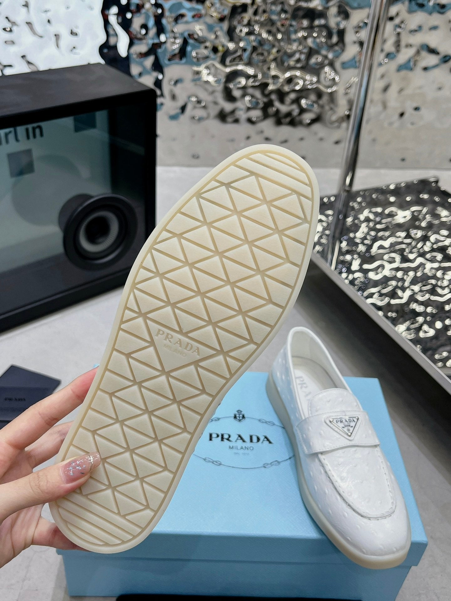 PRA OSTRICH PATTERN LOAFERS WHITE CALFSKIN