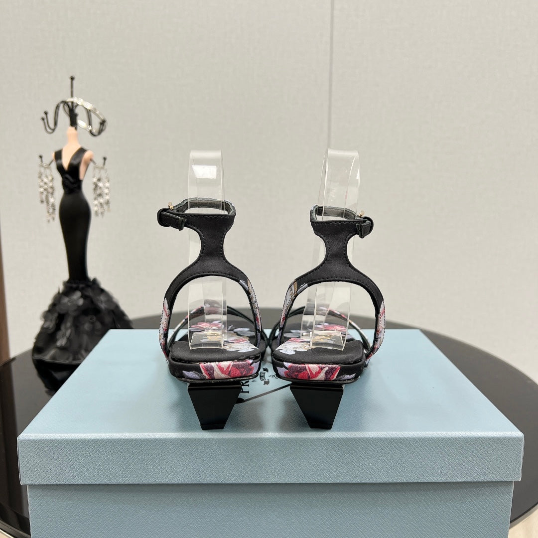 PRA TRIANGLE HEEL FLOWER MOTIF SATIN SANDALS BLACK