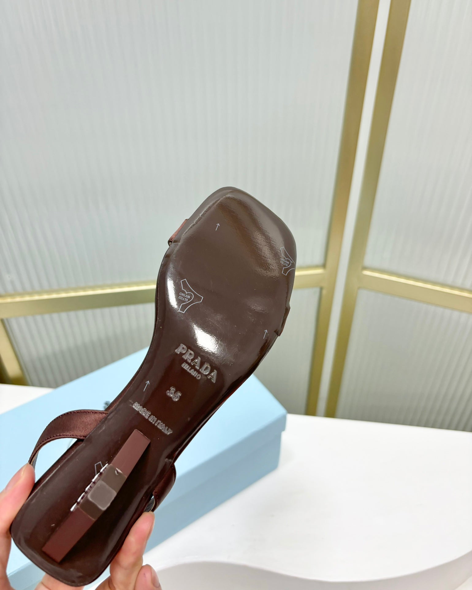 PRA TRIANGLE HEEL SATIN SANDALS BROWN