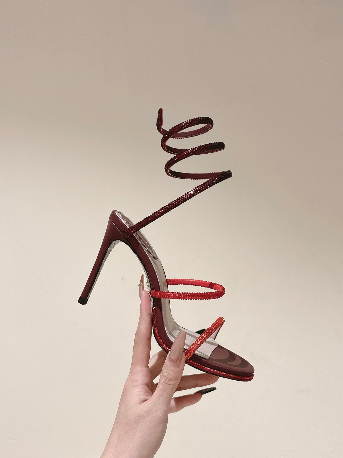 RC 25 Snake-Shaped High-Heeled Sandals Dark Red Silk Rhinestones 268061