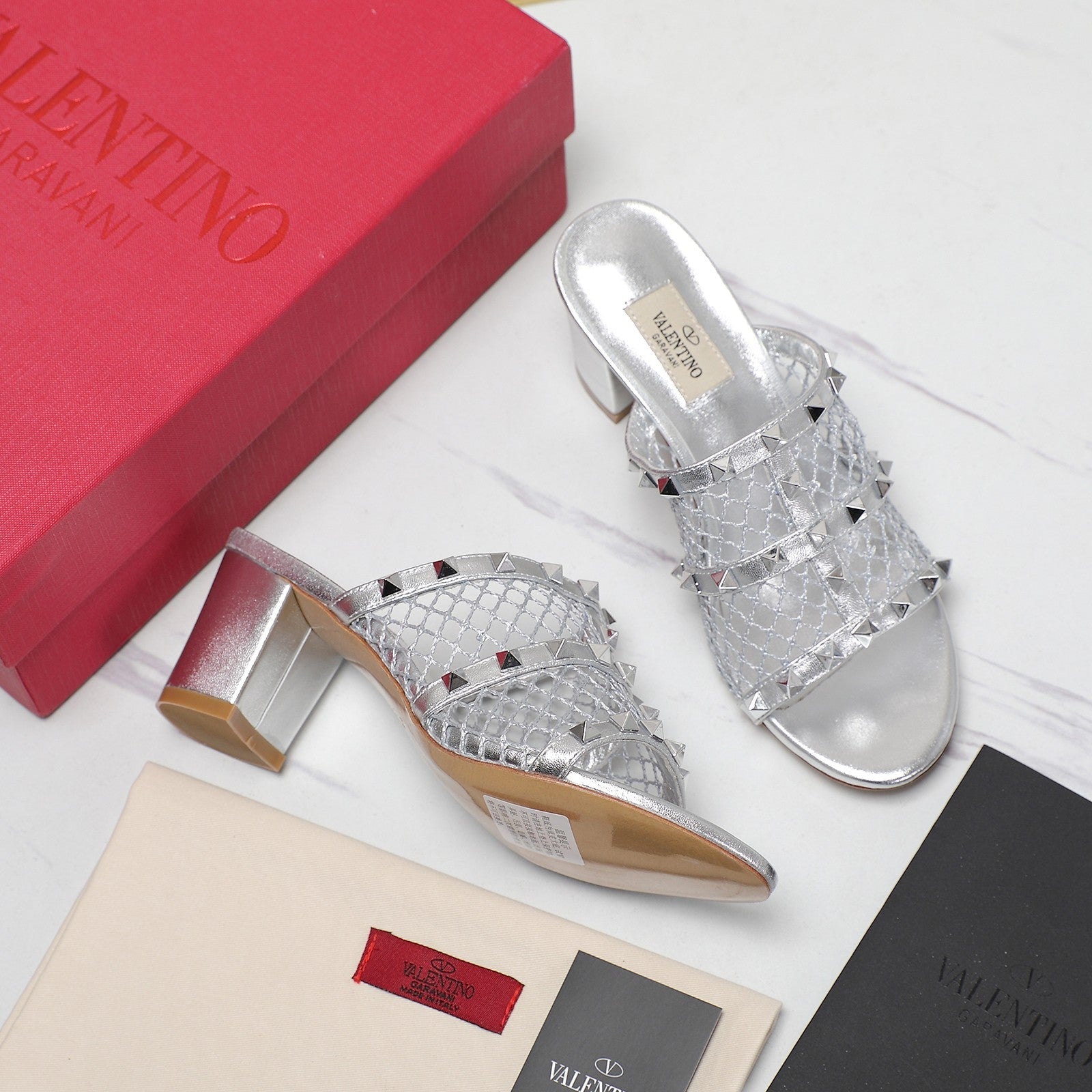 WOMEN'S BLACK ROCKSTUD SILVER MESH SLIDER SANDAL WITH MATCHING STUDS 65 MM